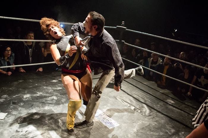Hoodslam thrives in subversion. During a battle between 1920s cocaine-addled gangster Drugz Bunny and brick-house superheroine “Ultragirl” Brittany Wonder, dueling “yes-chants”– pointing to the sky and screaming “yes” in rhythmic, cultish synchronization — emerged. “DRUGS! DRUGS! DRUGS! DRUGS! ASS! ASS! ASS! ASS!”