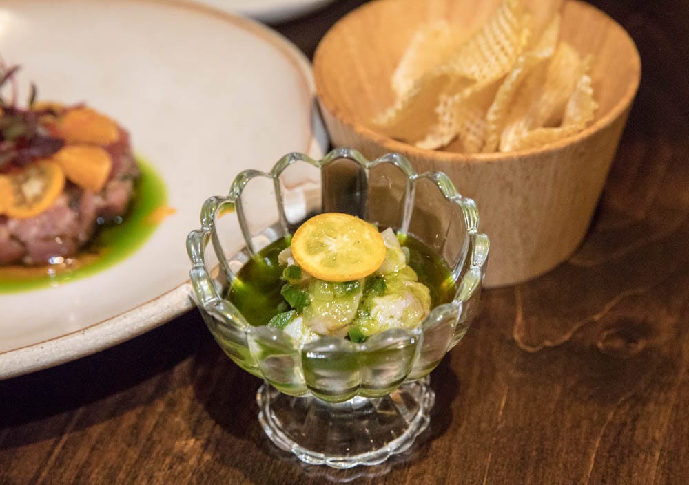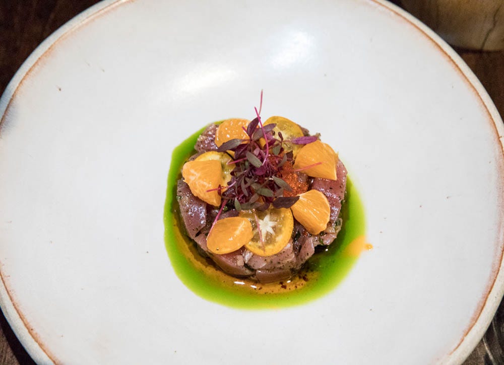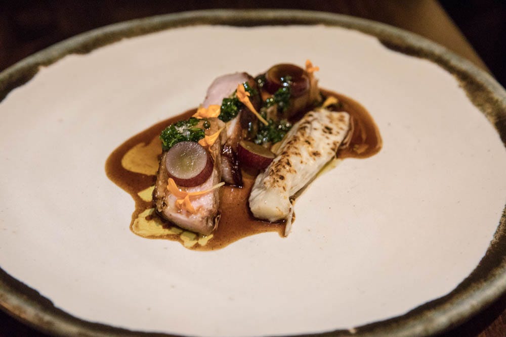 Raw fish is clearly one of chef Saint Louis’ strengths and a lighter start to the meal, highlighting local fish. Seabass tartare swimming in tiger’s milk (citrus-y leche de tigre) was followed by ahi tuna crudo of the day accented with mandarins, kumquats, seaweed salad and lemon caviar (caviar source being France’s Caviar Perlita). One was on the tasting menu, one a la carte, both standouts in the meal, scooped up with crispy house pomme gaufrettes chips, begging for a glass of sparkling wine.