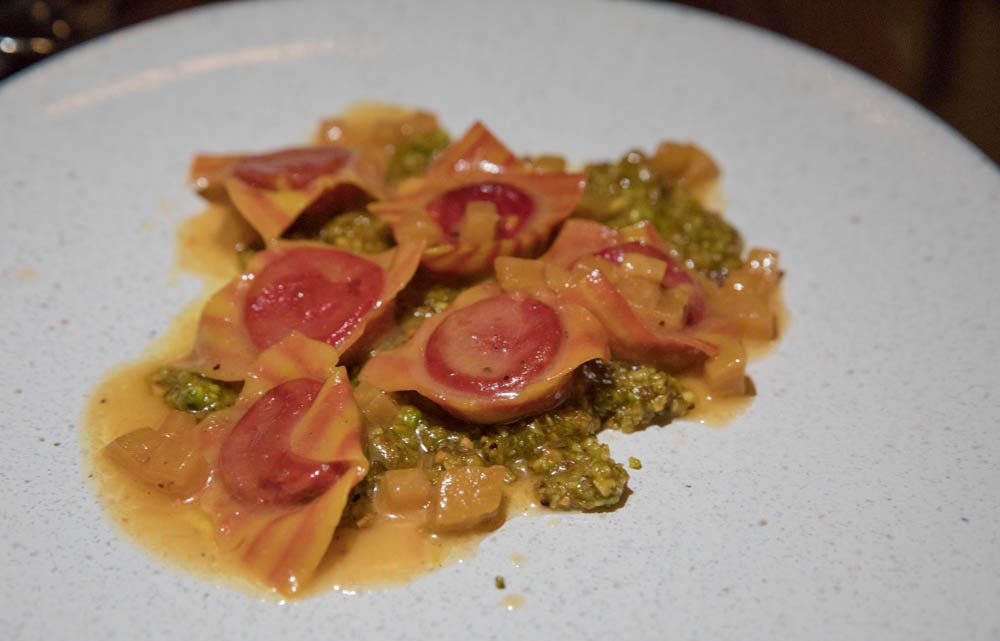 Maybe the most exciting pasta? Vegetable-based turmeric and beet corone filled with ricotta, bright like California winters with preserved blood orange, kumquat, evoking Sicily with a generous, crunchy pistachio base laced with curried calçots (Catalan green onions).