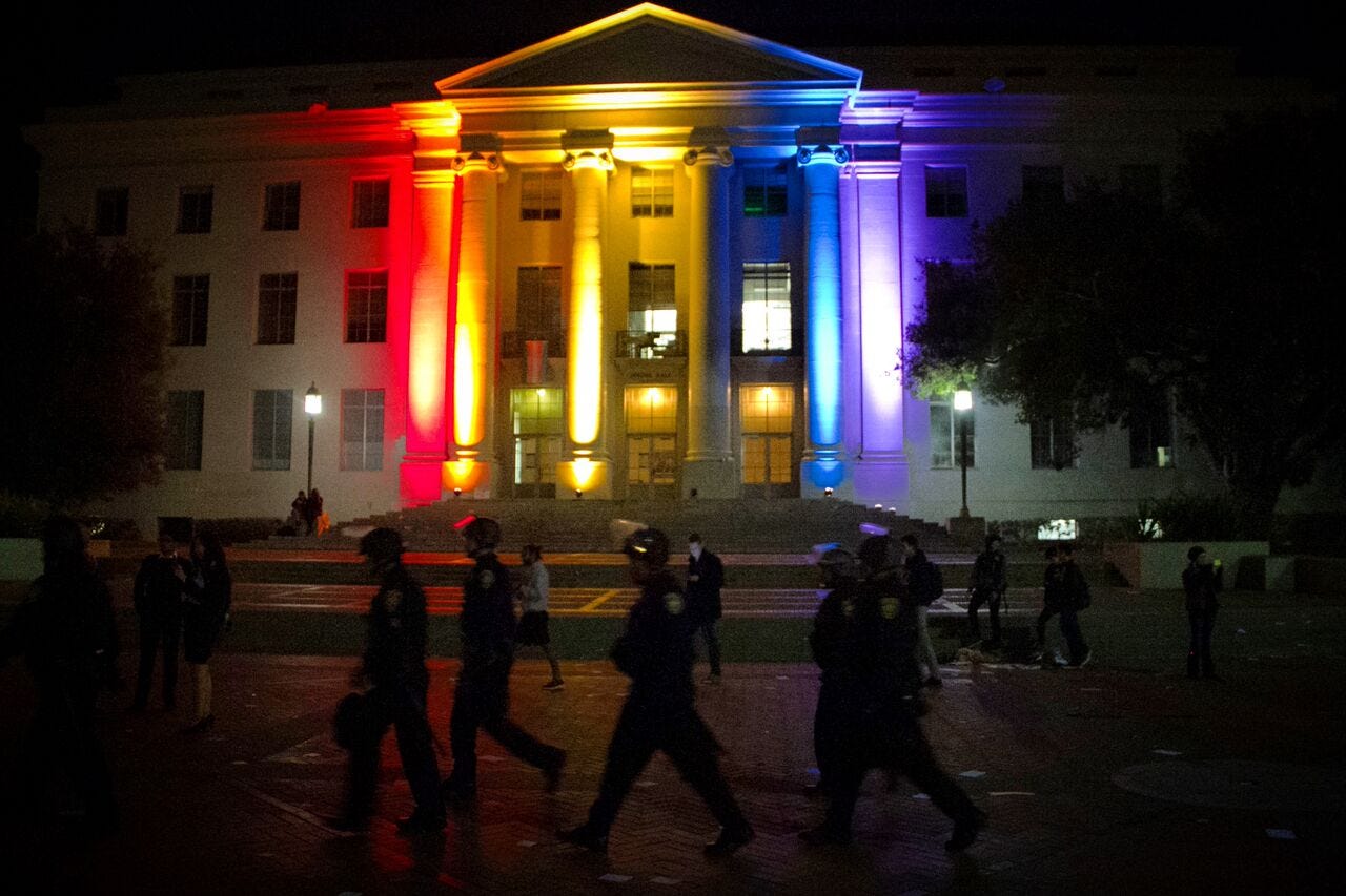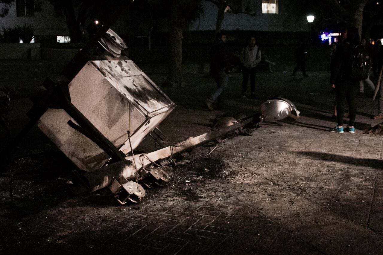Alt-right provocateur Milo Yiannopoulos’s scheduled appearance at the UC Berkeley Student Union was canceled after campus protests turned violent. A lighting fixture set up for the event was lit on fire, which then spread to a nearby tree. Several windows of the student union were smashed.