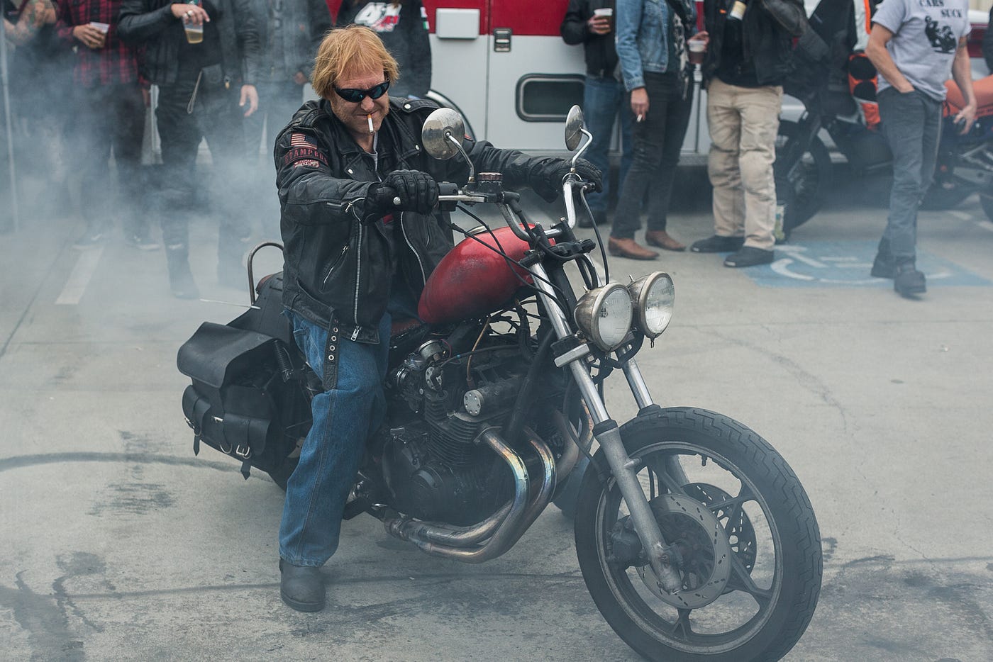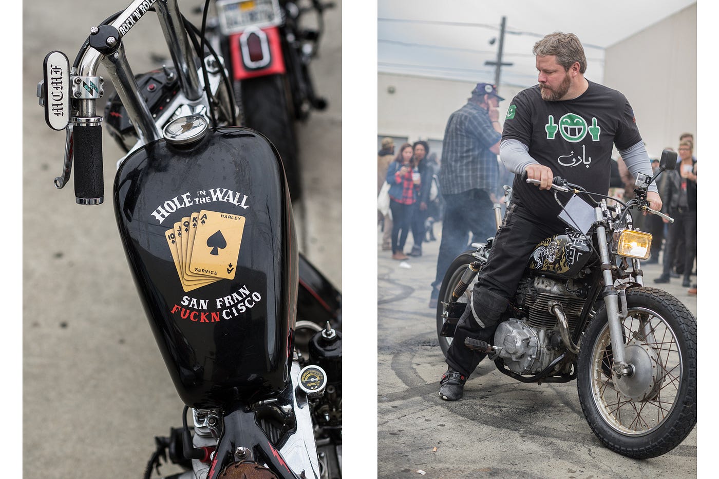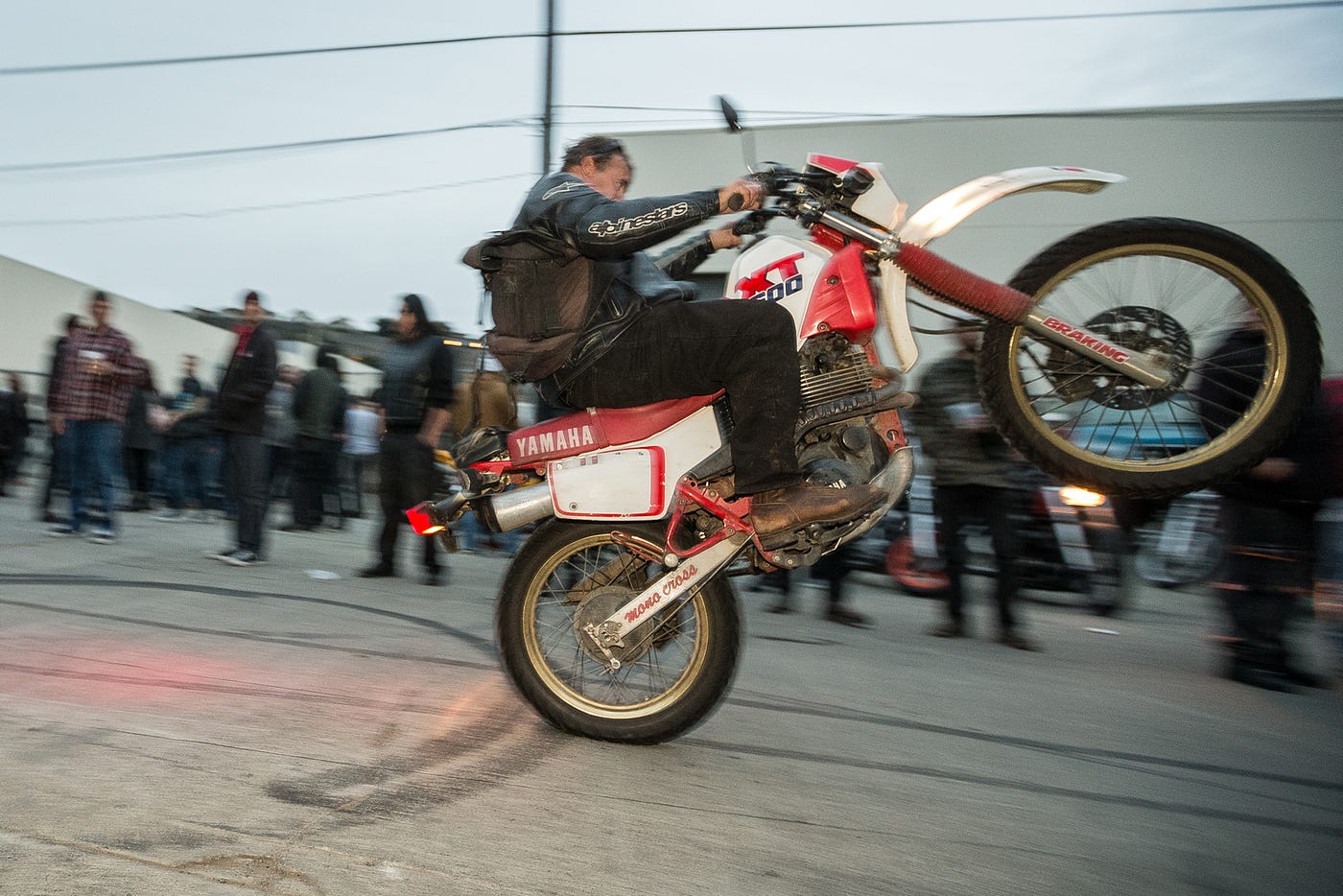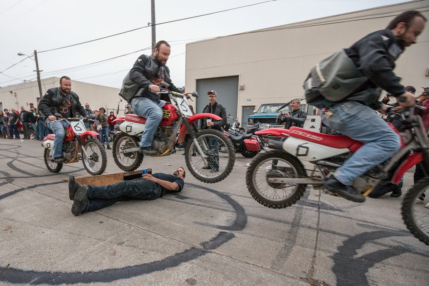 Leather jackets, full body tattoos, and heavy beards. It would almost sound like the Folsom Street Fair if not for the overwhelming aroma of burning rubber. Every year in October a handful of enterprising gear heads start building choppers from whatever bits and pieces they can kludge together for under $1,000. Once the official website posts the go-ahead, they have one month to build their hearts out. Last Sunday the buzzer rang and the Dirtbags gathered for a 100-mile ride and a party in the industrial district of Bayview.