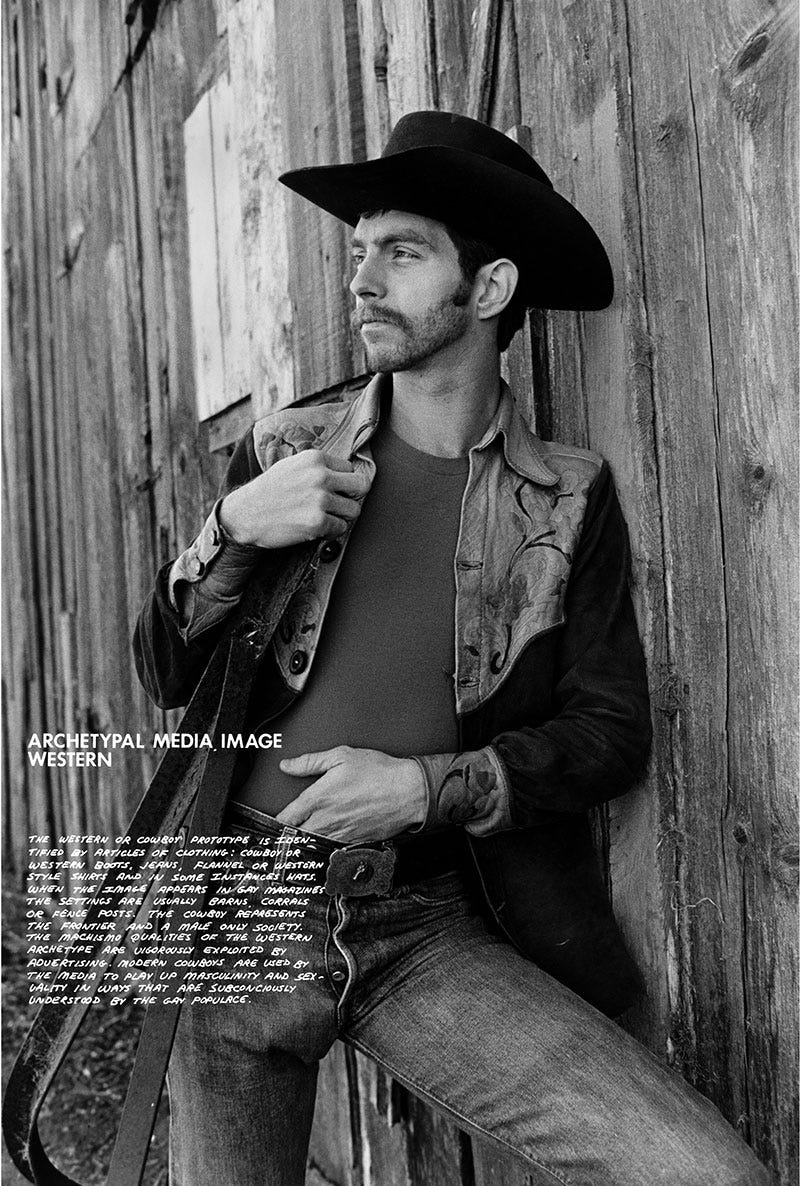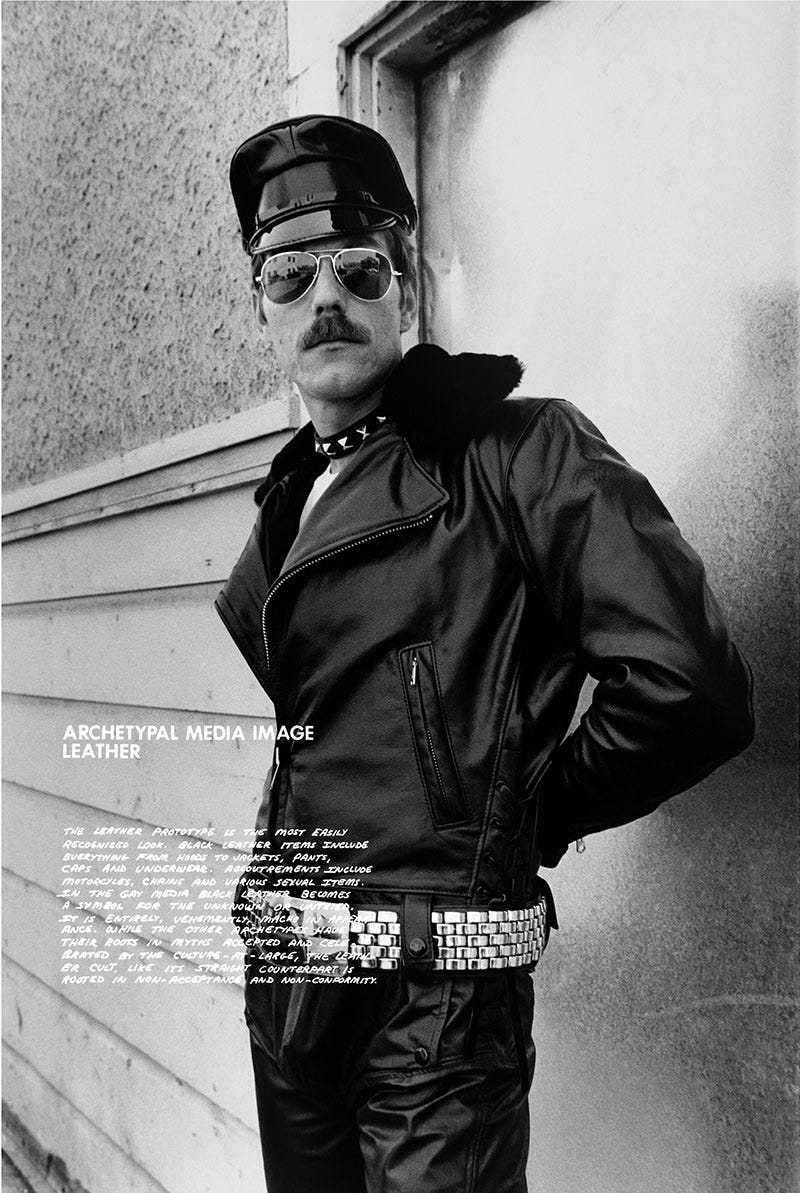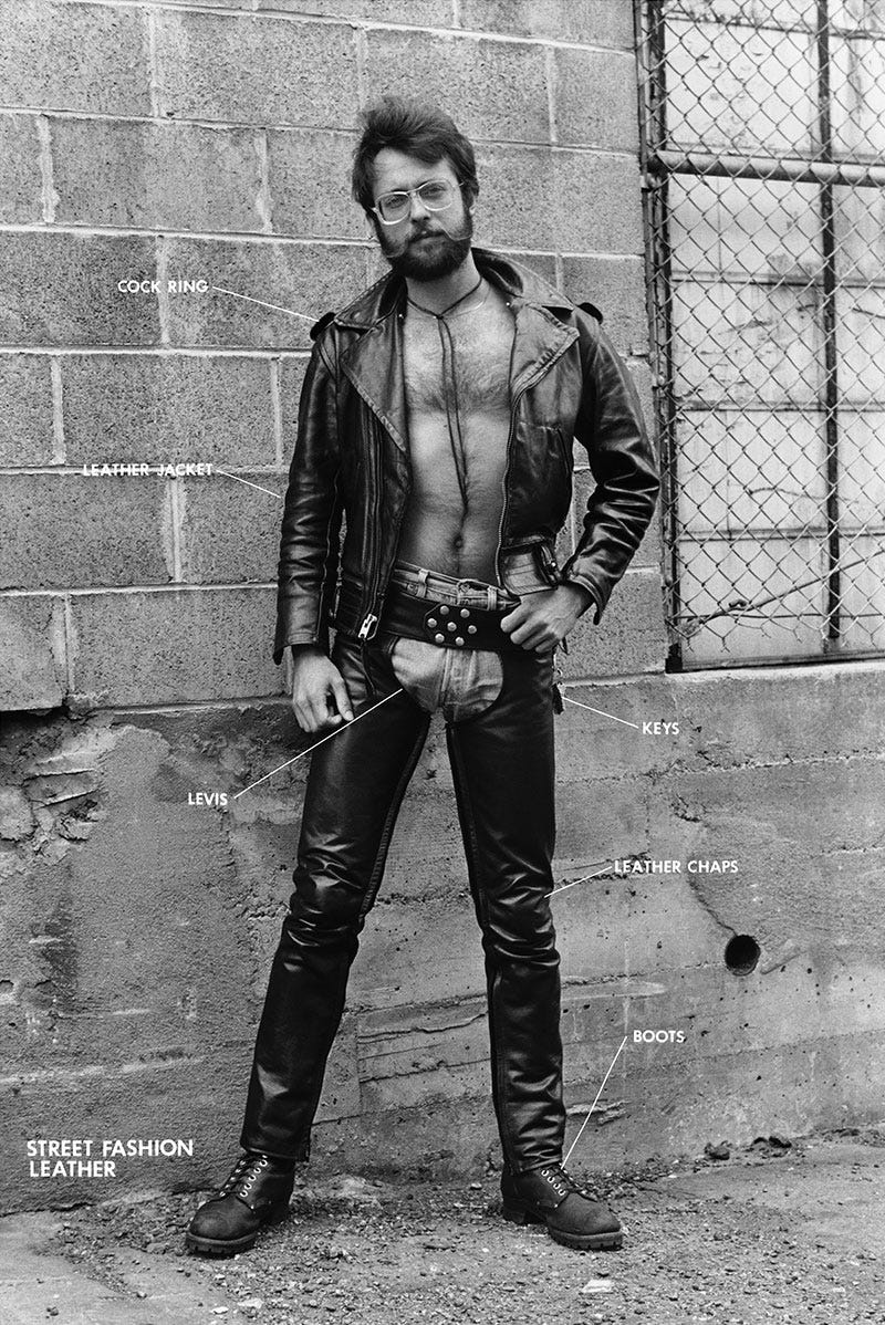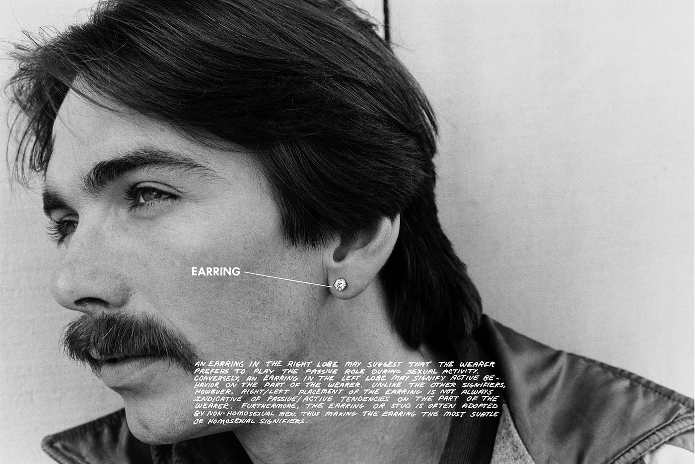 As its title suggests, Gay Semiotics is a pseudo-academic breakdown of gay signifiers including earrings, leather, poppers, and western wear. Fischer’s captions are equally anthropological and irreverent, as his decoding of handkerchiefs demonstrates: Handkerchief placement indicates whether a man is a top or a bottom, although sometimes they’re “used in the treatment of nasal congestion…and hold no meaning in regard to sexual preferences.”