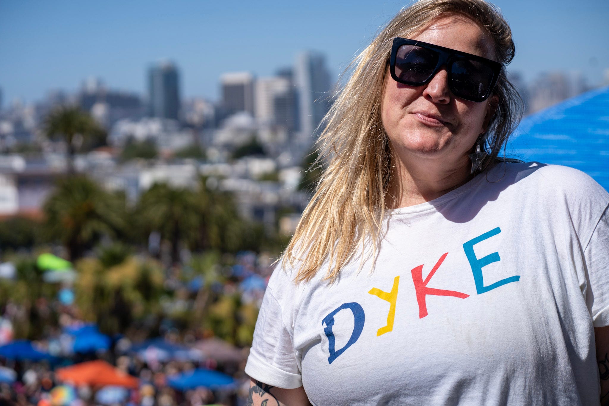 They told us, “We always come for Dolores but are usually too hungover for the parade. We’ve walked the parade a bunch of times, so we don’t feel like we need to do it anymore. But when we do the parade we go to see the dykes on bikes and then we usually leave after. But today (the park) is what Pride is about, and why we come from all the way Oakland every year.”