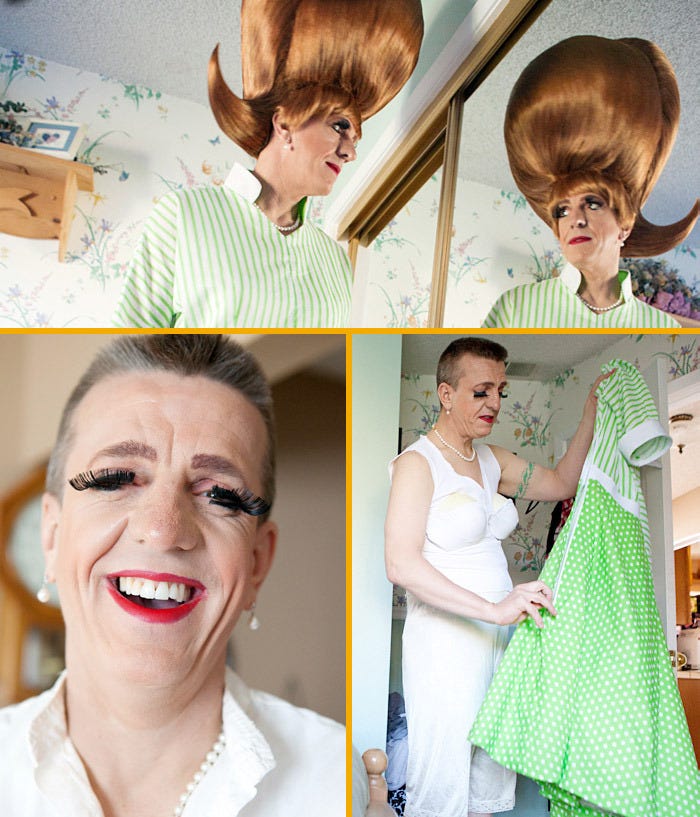 I ring the doorbell of a suburban South San Francisco home and am greeted by towering Southern belle Helen Waite. Helen is decked out in a bright green ‘50s-style dress, pearl earrings and necklace, white gloves, and white patent leather heels. Her hair, bright auburn and styled in a three-foot beehive, bulges from her head like an oversized Kewpie doll. Helen welcomes me into what is about to become an afternoon unlike any I’ve ever experienced.