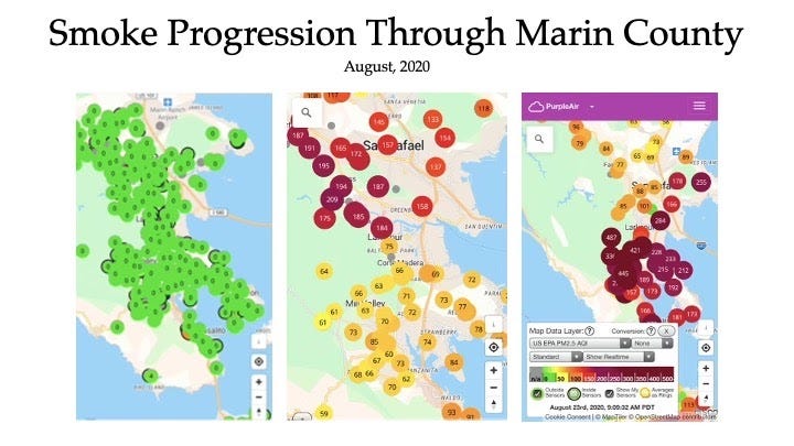 I mounted mine on the side of my house in Marin County, just north of the Golden Gate Bridge. Between August and September of 2020, the smoke drifted southward to Marin, as shown in the following series of PurpleAir maps generated during that time.