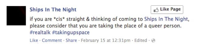 In anticipation of last weekend’s Ships In The Night, a monthly at The New Parish, organizers of the event posted a Facebook update blatantly discouraging cis straight folks (heterosexual people whose gender matches the sex they were assigned at birth) from attending the party.
