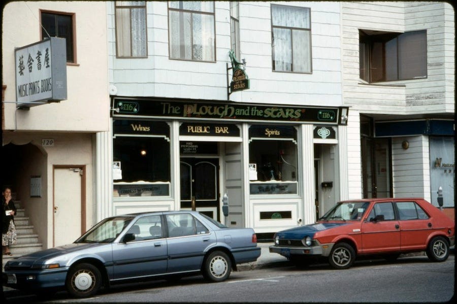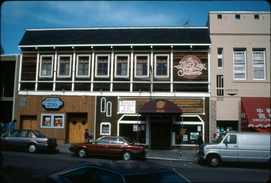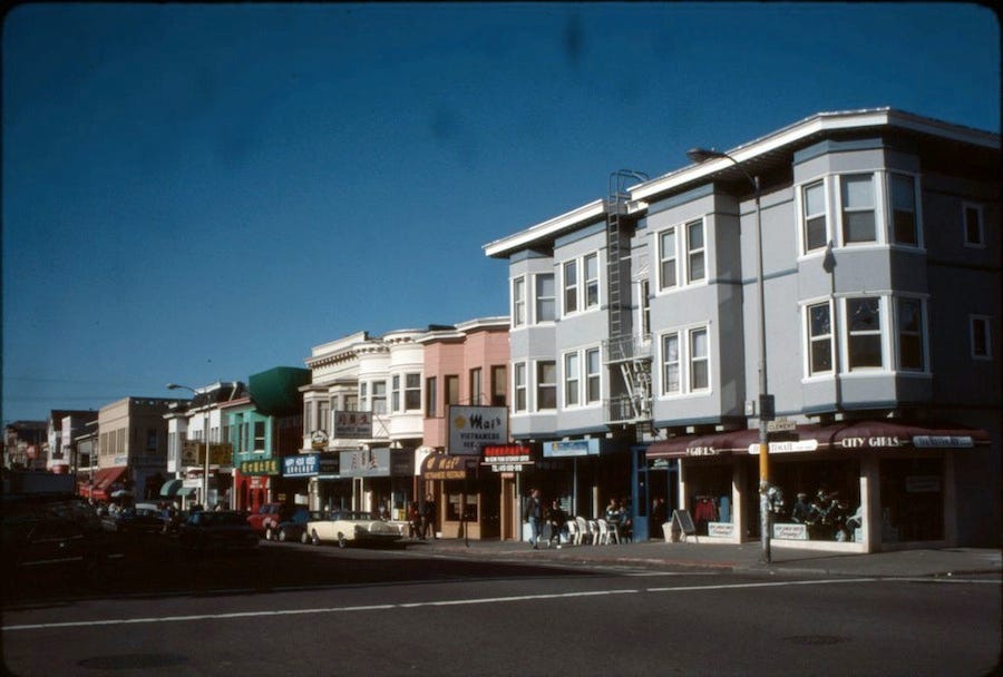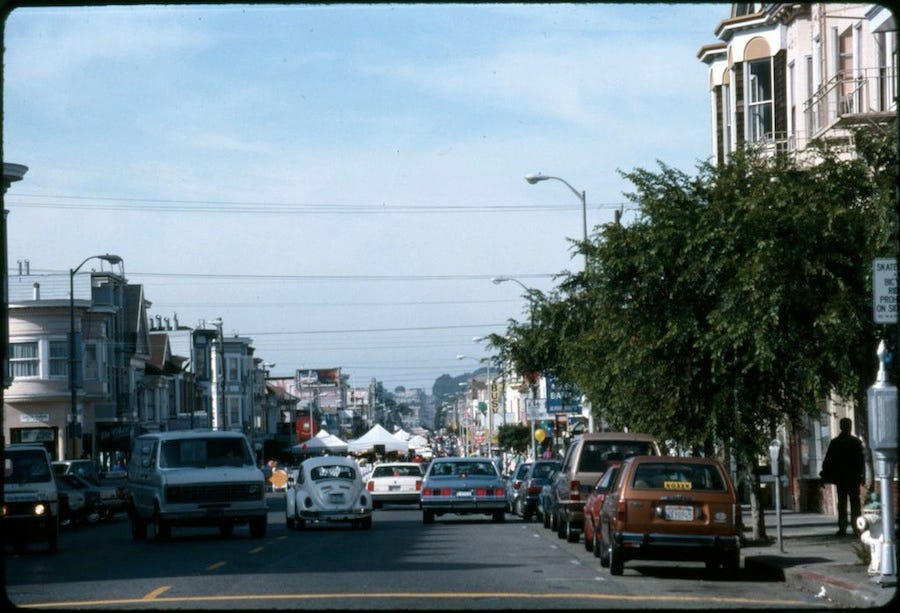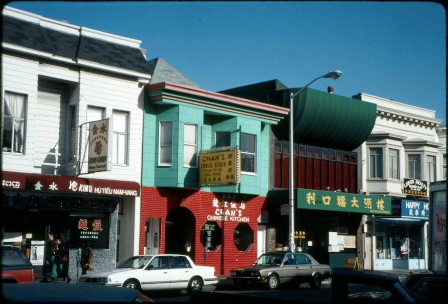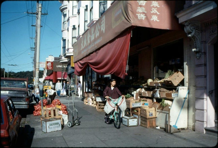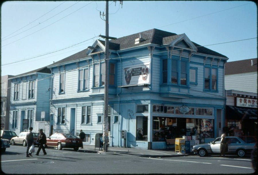 The Inner Richmond was almost SF’s version of Colma in terms of corpse real estate. It was home to many cemeteries and as one source charmingly puts it, “some of the earliest inhabitants were dead.” Eventually live people settled in the area and it would be a mistake to call this robust neighborhood dead today. Even in these pictures captured in the early ’90s, you can see streets full of life and culture. These images come thanks to our friends at the Robert Durden Color Slide Collection at the San Francisco Public Library and are part of our partnership with non-profit Historypin and their Year of the Bay mapping project. (You can add your memories to these images over at Historypin’s Year of the Bay site.)