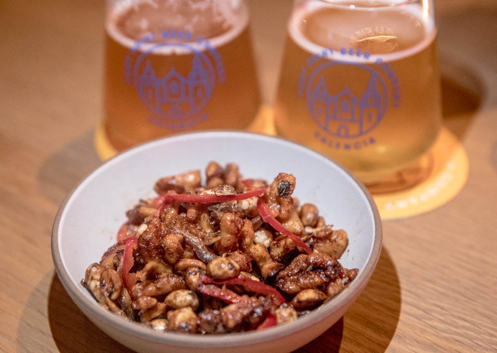 They closed during the pandemic, less than a year after opening, and I wasn’t sure if they’d return. Thankfully, Fort Point Valencia reopened on February 9th, 2022. I was impressed from day one with chef Eric Ehler’s (formerly Mister Jiu’s, Black Sands) utensil-free dishes beyond the usual brewpub fare, from yeast-leavened “party bread” to vegan yuba club or pork chop sandwiches. With Ehlers gone post-reopening, I wasn’t sure if it would hold up on the food side, much as I never questioned the drink.