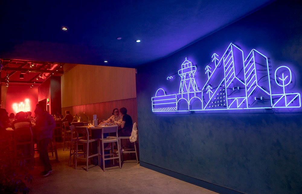 In October 2019, they opened their first taproom/restaurant in the heart of the Mission: Fort Point Valencia. From the beginning, it was an unusual brewpub/beer restaurant that category needed. Instead of yet another industrial brewery space or wood and brass pub cliché, electric blue walls and skylights meet neon signage by artist Shawna Peterson and minimalist white lines and lighting along the bar. Designed by Fort Point’s chief brand officer Dina Dobkin, executed by creative studio Medium Small, a mixture of long wood booth tables and bar-height tables line the lofty, narrow space, flanked by a white-on-white mural by local sign painters, New Bohemia Signs. Bold color meets almost Zen-like neutrality, making the space feel forward-thinking and soothing at the same time.