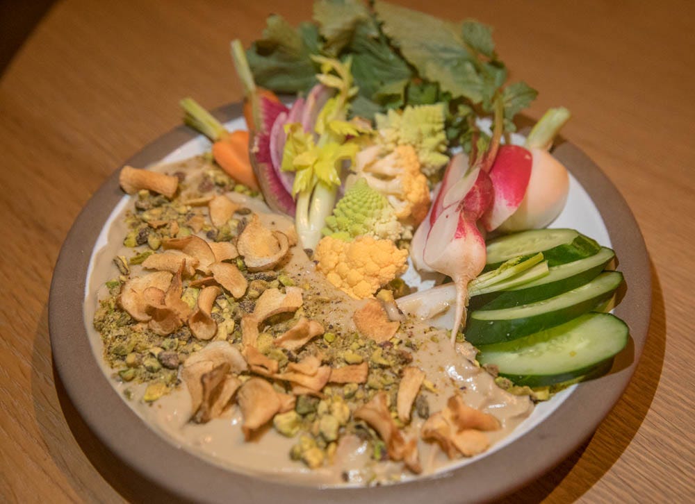 On the more robust starter side, sunchoke dip starts to run a little sweet as you keep eating the generous portion, but a crisp round of crudités, from Romanesco to radishes, dusted in pistachios, is garden-fresh happiness and the right contrat. Crispy veggies sing not just with beers but with a tight wine selection that includes pours to please natural and local wine lovers, like a balanced Edmunds St. John’s 2020 Heart of Gold Grenache Blanc/ Vermentino from California’s Sierra Foothills, or a zippy 2020 Pequenos Rebentos Loureiro Pet Nat from Minho, Portugal. On the lighter ABV side, Flying Embers pineapple chili hard kombucha on draft also pairs buoyantly with a few dishes.