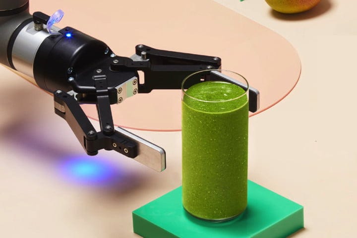 As implied, Blendid is a smoothie-making robot. Functionally, it’s extremely similar to CafeX: there’s a robot arm that moves from blender to blender to cup, mixing smoothies and then pouring them out accordingly. Like CafeX, there’s a plexiglass screen separating the smoothie operation from your grubby hands.