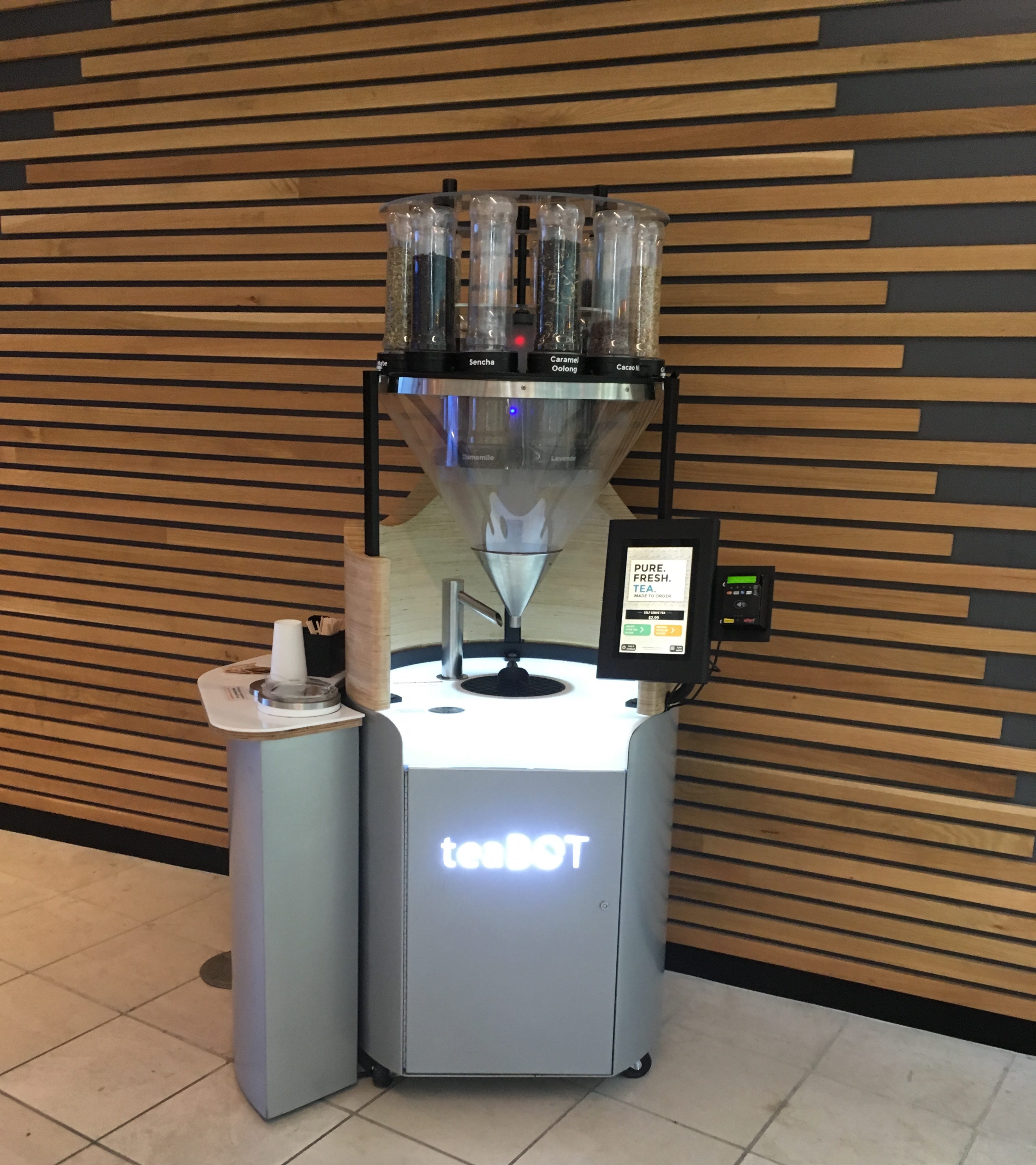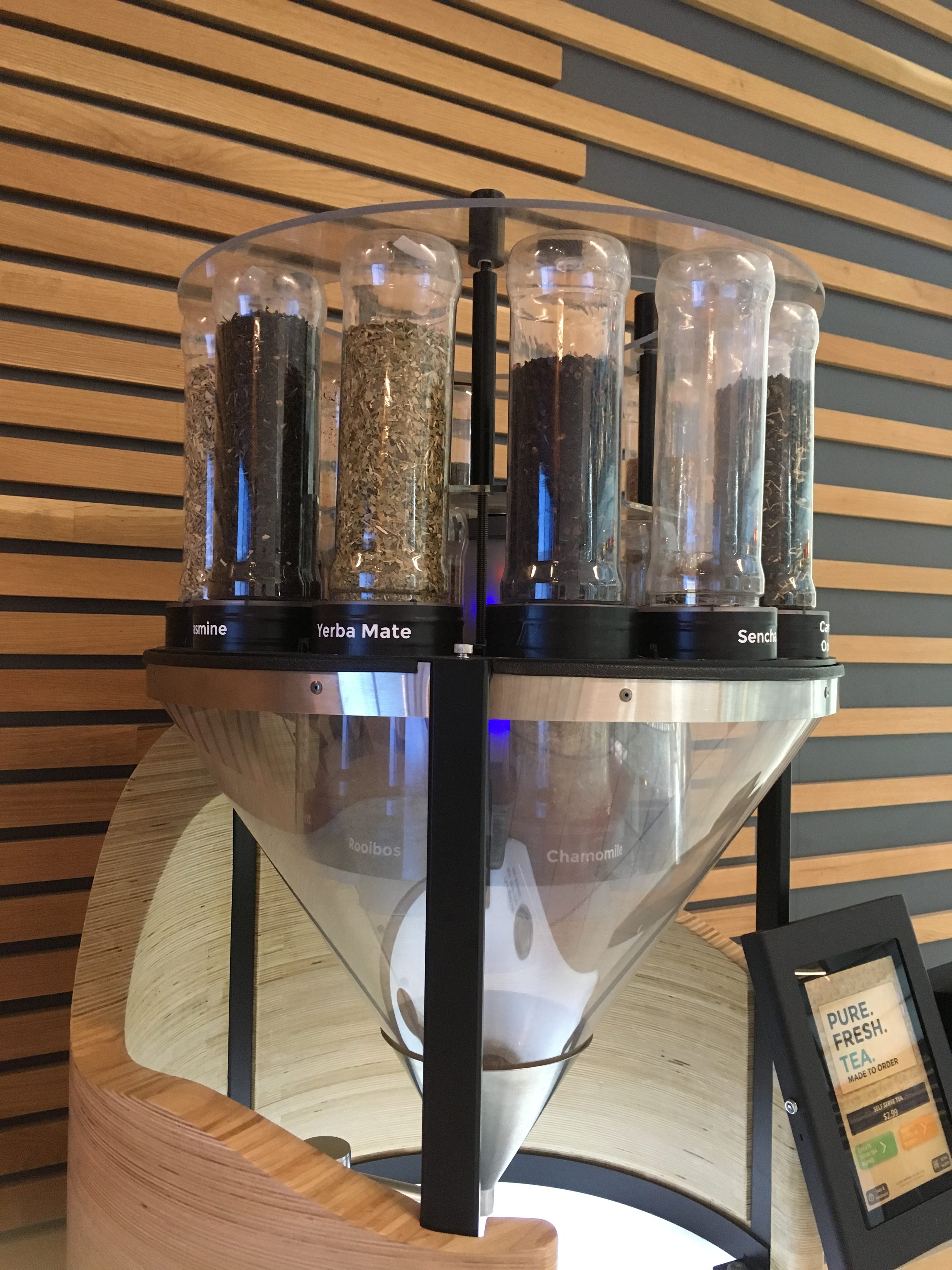 Is this an “innovation” in tea? Not really. It’s just a different way of going about tea preparation in an extremely controlled manner. I selected 40 percent cacao nibs and 60 percent amaretto black-tea leaves for a comforting drink that tasted sweet but had no sweetener. The price point is pretty low, around $3 depending on one’s selection, though you have to pay by credit card (otherwise, how are they going to get customer data that they can monetize?). I don’t think the machine is all that popular; there wasn’t a line like there was at the CafeX robot. This machine is in the Westfield Mall near the escalator that leads up to the movie theater.