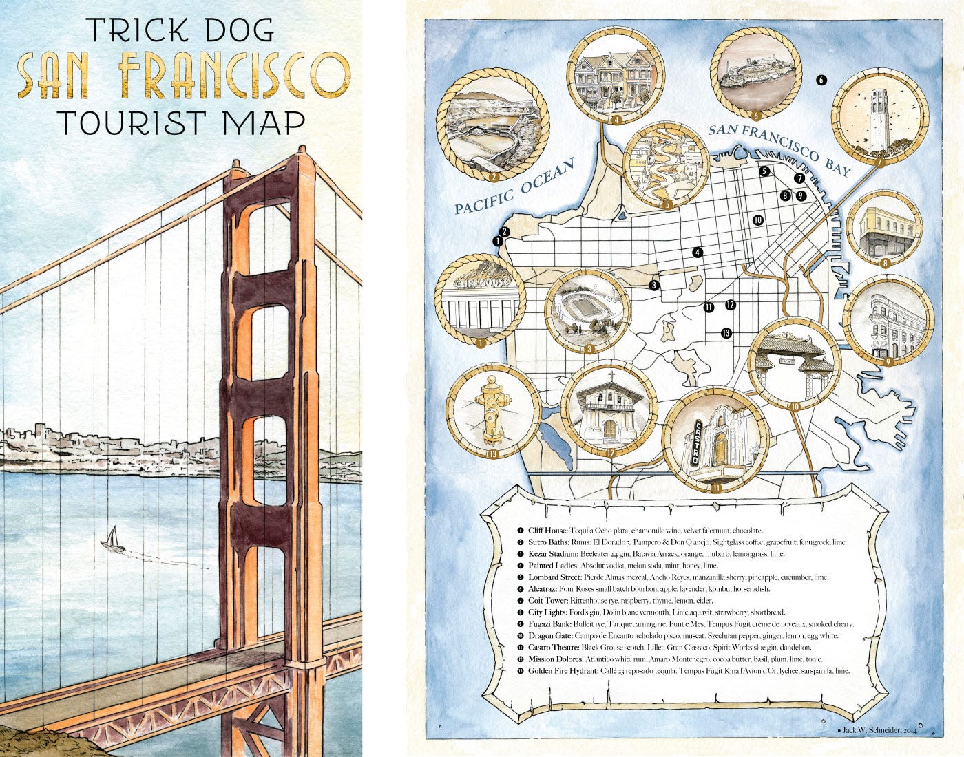 Often, deciding on which intricate, amazing-sounding cocktail to order is difficult. But shouldn’t it be more difficult? Trick Dog, the cocktail bar in the Mission thinks so, and it has set the bar for creative menu design really, really high. Its first menu was a Pantone swatch book, followed by a vintage record album with each drink printed on its own 45, then in January it unveiled a sliding astrology wheel. Today, at 3 p.m. Trick Dog debuted its fourth menu: a tri-fold tourist map of San Francisco, with each drink named after an SF landmark.