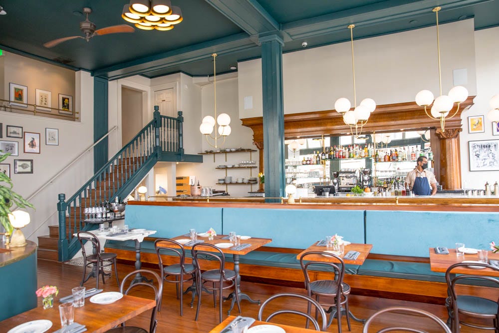 Months in, Dan and I came in for our first in-person visit. The romance of the corner space on California and Divisadero hits first. It definitely has French-bistro-meets-European-cafe vibes with clean, modern lines. Inviting, charming and light-filled with big windows casting a glow over wood-and blueish-green banquettes, lamps and vintage china/plateware.