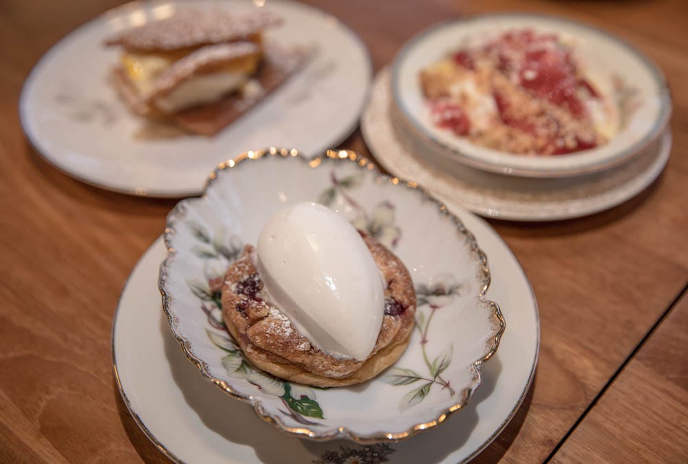 Whether “butter sticks” in strawberries and mascarpone in a past visit, or a mango vanilla Napoleon in paper thin, fried pastry sheets this return, Leong’s delicate hand with pastry almost brings a tear. “Melt in your mouth” is a phrase invented for whispers of pastry like this. Equally arresting is pineapple coconut tapioca pudding with crispy-fruity contrast from a pineapple, strawberry and coconut crumble.