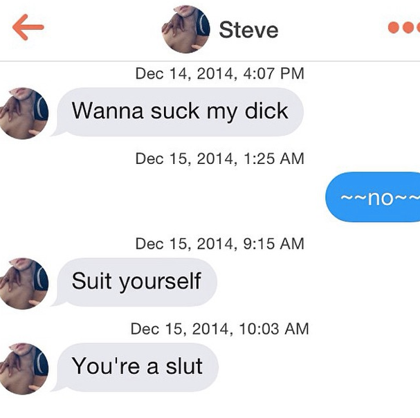 Alexandra Tweten founded an Instagram account called “Bye Felipe” as a way to hit back at the dickstorm out there. Bye Felipe, a play on “Bye Felicia,” allows people to submit screenshots of their interactions with “nice guys” on Tinder and OkCupid. The speed at which these dudes go from being polite to being downright hostile is enough to make your head spin.