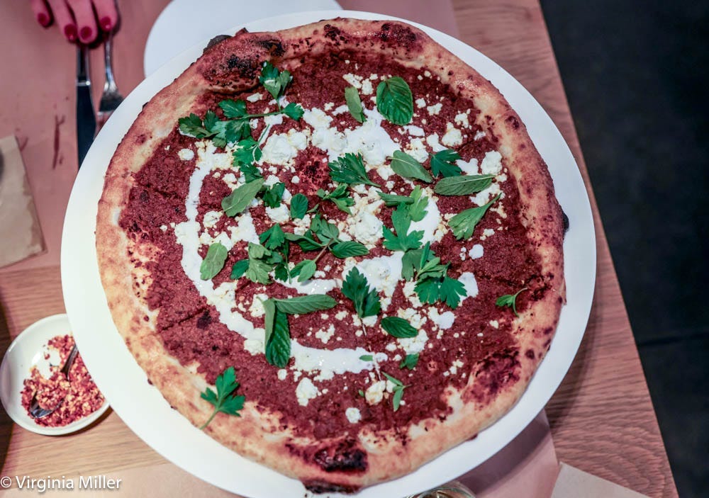 Pizza Wednesdays offer a reasonable $40 prix fixe of pizza, salad and a “surprise” starter, like irresistible black rice arancini in spicy tomato sauce with citrus aioli. Entrees like a dense, comforting corn custard pudding and turkey sugo tastes like the holidays. Pizzas wow in a modern California way, whether a squash, walnuts and cotija cheese LA pizza, or truly unique Musa, a thin but filling pie topped with ground lamb stewed in Turkish chilies, cinnamon, black pepper, date syrup, sumac, barrel-aged feta, yogurt, mint and parsley.