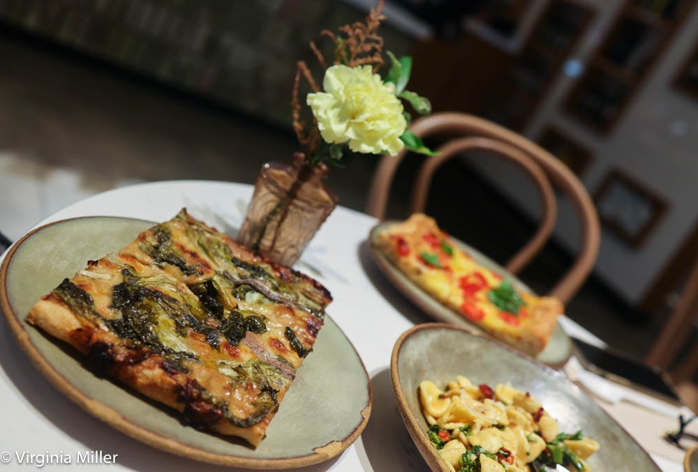 The original A16 on Chestnut Street just turned an impressive 20 years old, predating the Neapolitan pizza craze that swept the country. Owner and award-winning wine director Shelley Lindgren just opened a Ferry Building location in February 2024: A16 La Pala. Instead of Neapolitan pizza, the focus is pizza al taglio, a rectangular focaccia pizza originally from Rome. In 6-inch or 9-inch slices, the simplicity of the Tomato Crudo with basil and garlic stood out, though the Escarola pizza was more interesting, layered with braised escarole, fior di latte mozzarella, anchovies and a killer crema di cipolla onion cream.