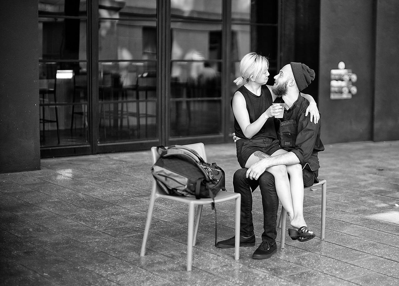 Love and coffee. A Blue Bottle barista enjoys a break with his girlfriend in Mint Plaza.