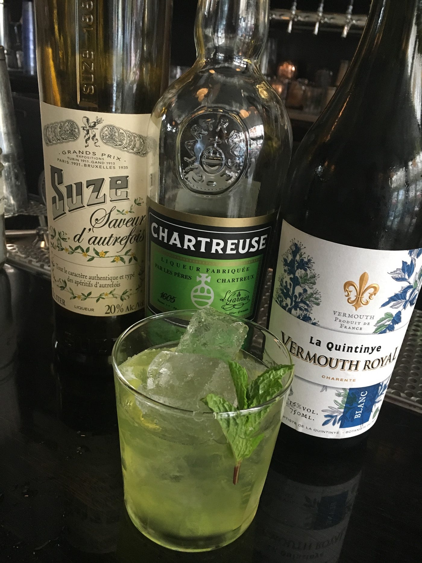 Howie Slater of Uptown Oakland’s beloved Drexl was seeing green when he concocted this French potion. It’s spritzy; it’s aromatic; and it will take your palate on a Tour de France of deliciousness. No ’roid boost necessary. (Sorry, Lance.)