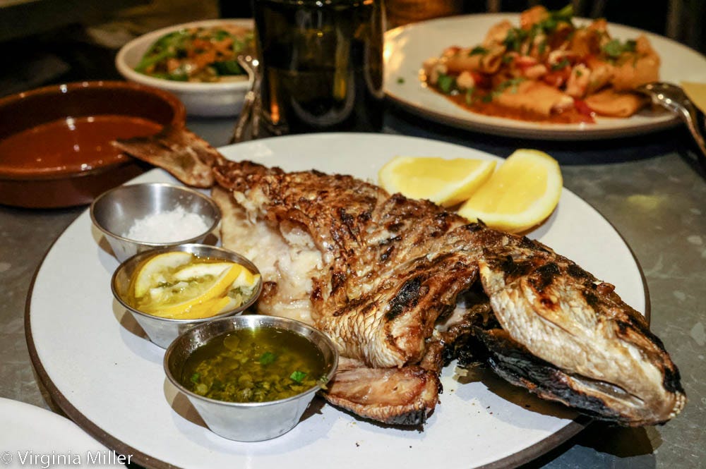 By now we’re stuffed, but we had to order one of two market price whole fish of the day (in two sizes). As lovely as the Louisiana red snapper sounded, that was the larger fish for a few people, so we opted for orata (dorade) white fish, the right size for two, simply grilled and accompanied by preserved meyer lemon conserva and an irresistible, oily, herb-laden salsa verde. It felt like a quick jaunt to the Mediterranean.