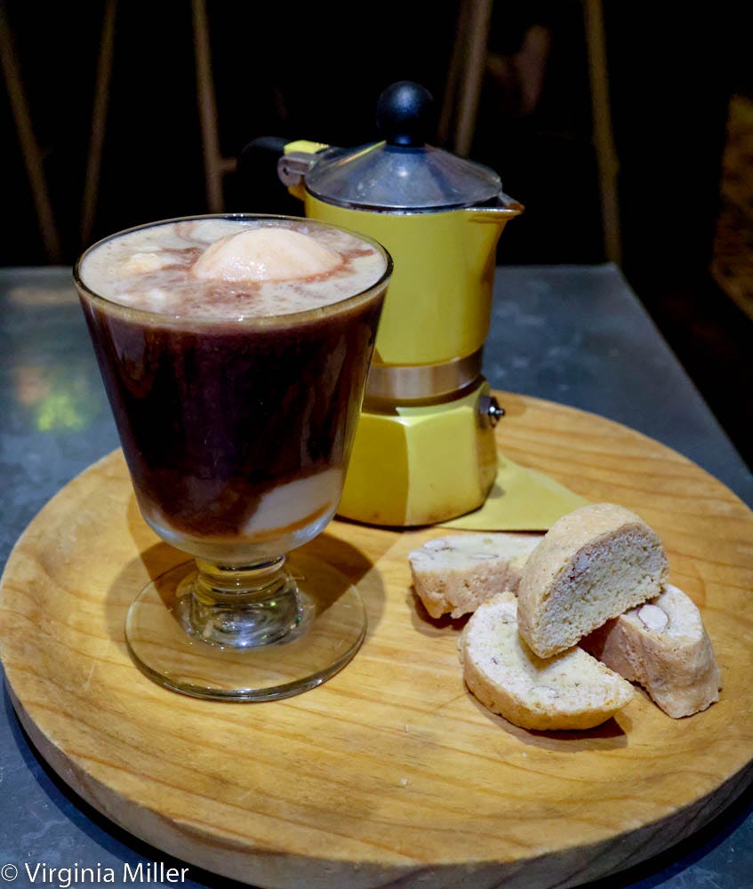 Affogato Corretto is the aforementioned gelato and espresso with my beloved grappa poured in (I love that corretto means corrected, in this case, the entire endeavor is “corrected” by the addition of liquor). The spirit can vary and here it’s the gorgeous herbaceous-bitter-sweet of Margerum Amaro, a California amaro I’ve long loved from Santa Barbara’s Margerum winery. A Jersey milk fior di latte gelato swirls creamily in espresso poured from a darling bright yellow moka pot, with almond cantucci (biscotti) to dip in, and the amaro added tableside. This reminded me that I wish for affogato this good all the time.