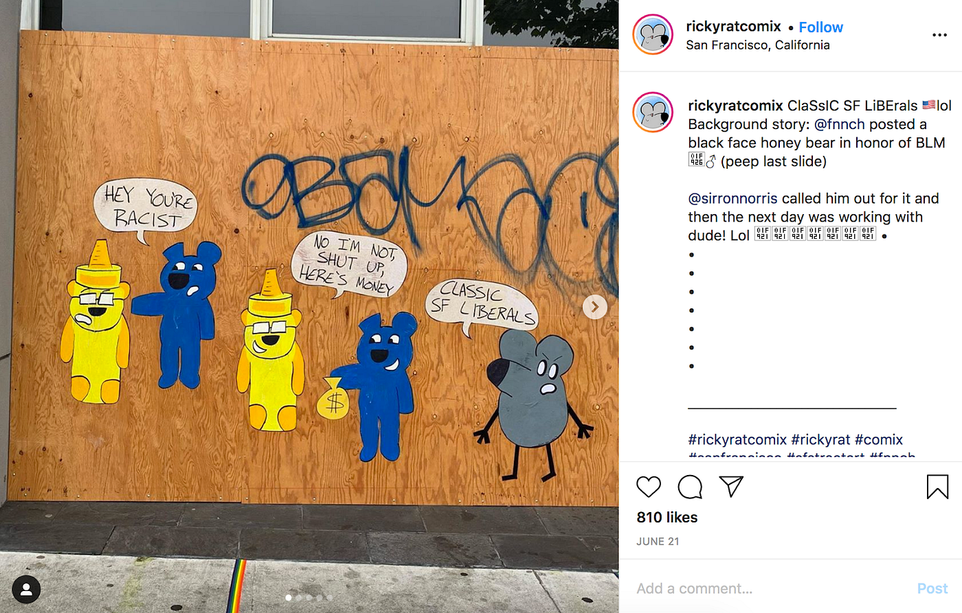 Enter Ricky Rat, a San Francisco–born cartoonist who was raised by Chicano-Portuguese and Lebanes- German parents across the Golden Gate Bridge in Marin County. Ricky has recently and very publicly pushed back against fnnch’s art, which he believes doesn’t deserve the massive recognition it has received, especially over what he views as the “Fisher-Price art” that often displaces the presence of local artists and issues.
