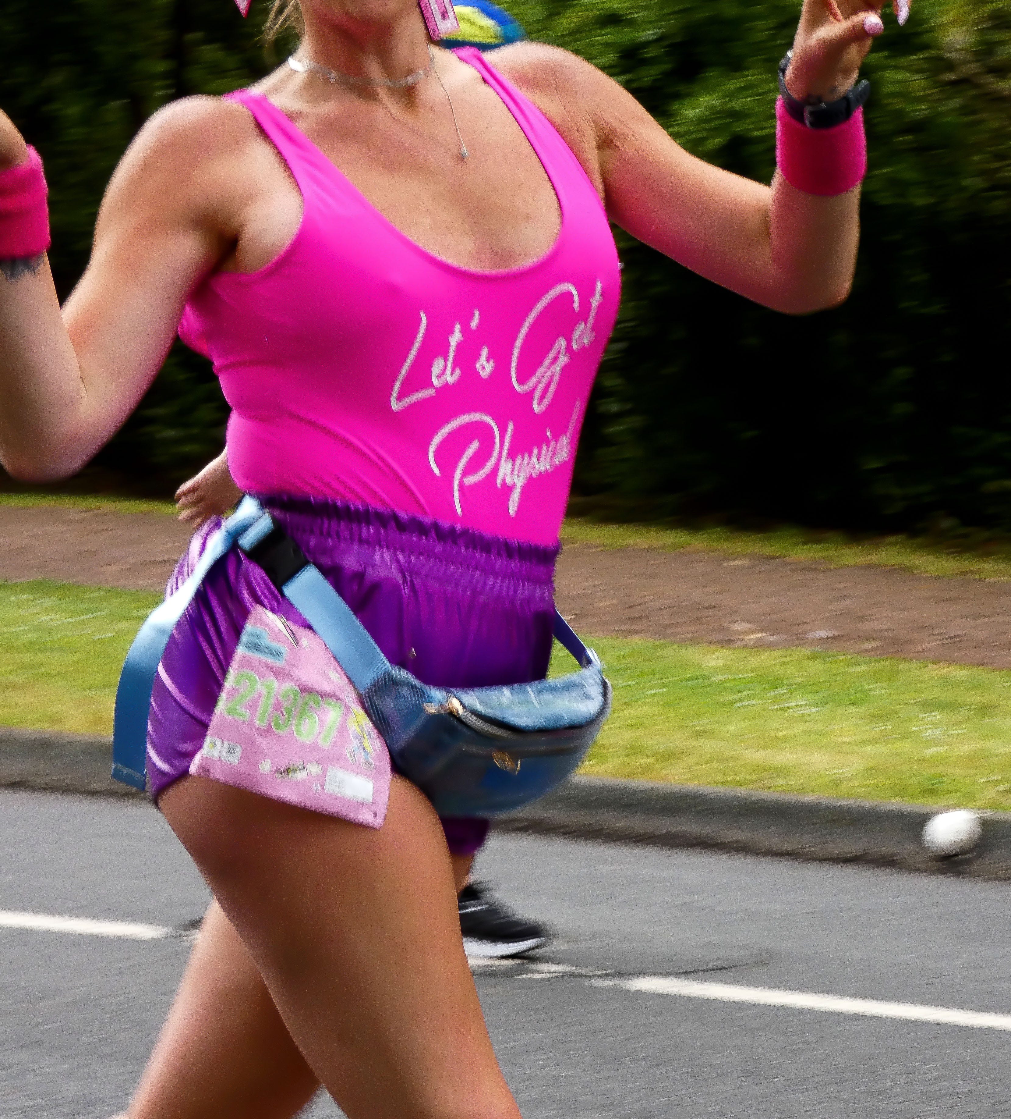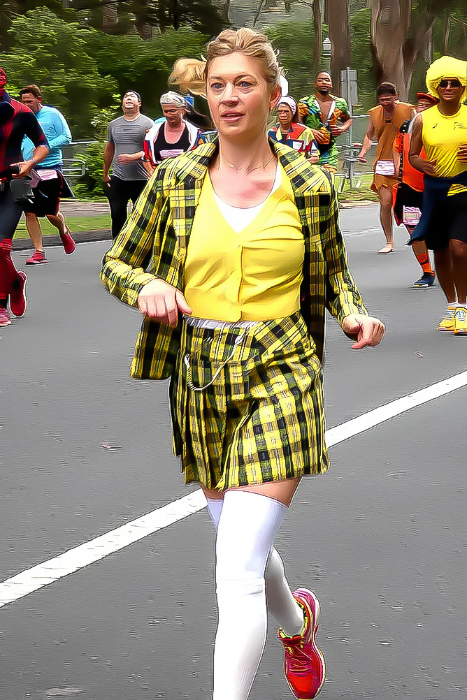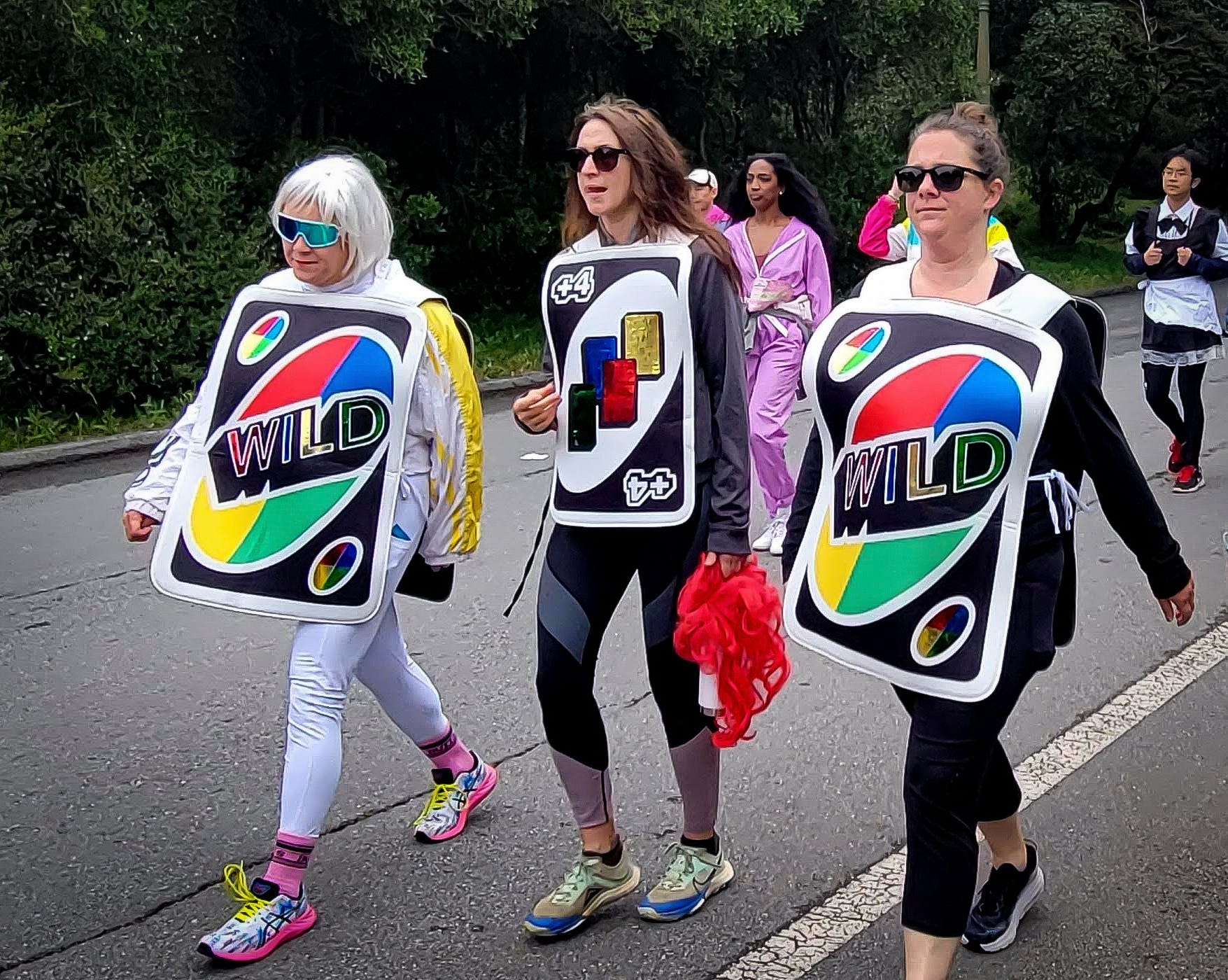 My running companion and I lost the quick-stepping mermaids on the Hayes Street Hill, but there were still some good costumes nearby. At the hilltop, I saw an octet of roller-skaters in sequin-spangled purple bodysuits, dressed to look like the pop singer, Prince, who had just died.