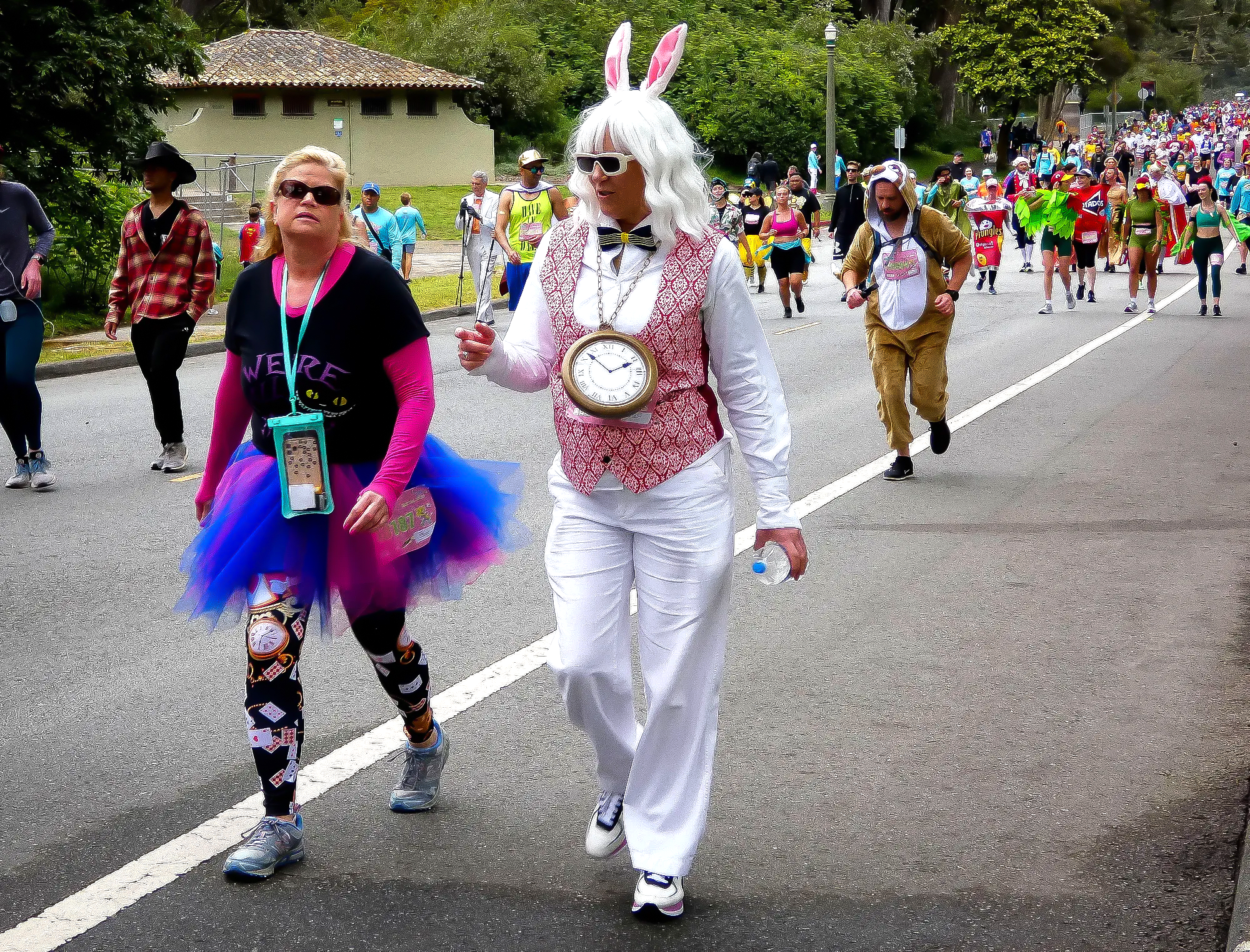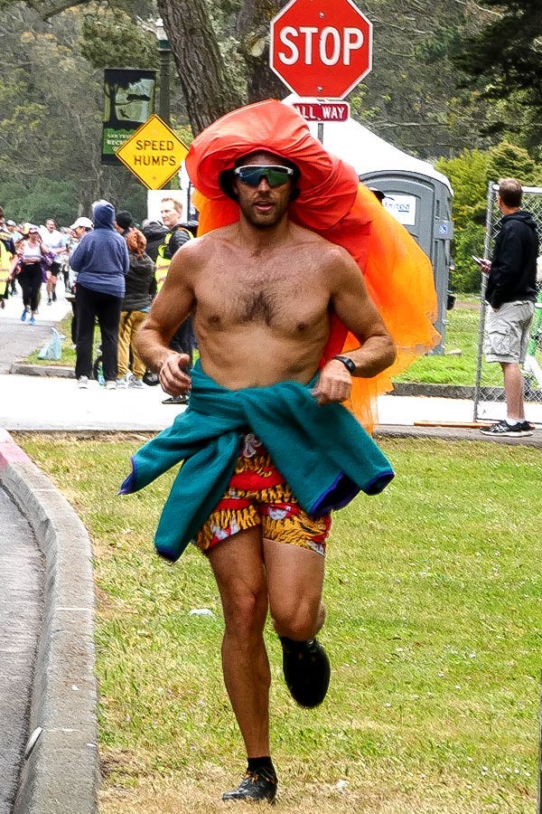 I also saw three runners impersonating David Bowie in his Ziggy Stardust period, lightning bolts across their faces, red hair bolt upright. One group, though, does not vary its costume from year to year. They dress as salmon and run against the race’s flow, swimming upstream. This contrariness seems very San Francisco — as do those runners who dress in nothing but their sneakers.