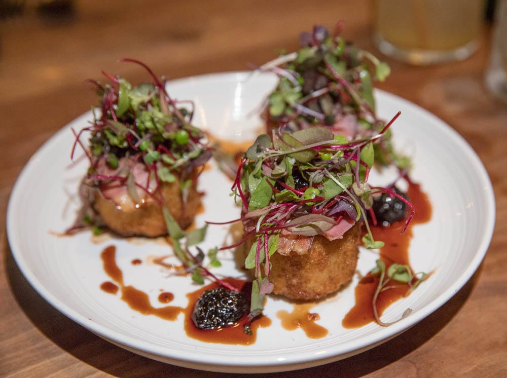 As the first dishes arrived, I was transported straight to Portugal with pastéis de bacalhau (salt cod-potato fritters), bacalhau being a staple of Portuguese cuisine. These warm pockets of salty goodness are dipped in cilantro aioli, though the rissóis de camarão (shrimp turnovers) with spicy piri-piri aioli are equally good. Arroz de pato, aka duck confit rice fritters, layered in cured duck breast and dried cherry chutney, beautifully (and decadently) contrast sweet and savory.