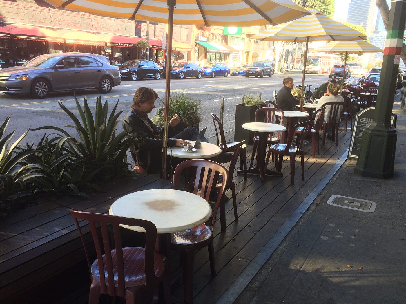Just outside of Caffe Greco in North Beach is one of the first parklets in the city. It has a charming European quality that makes it a nice spot to sit and people-watch while you sip your cup of coffee.