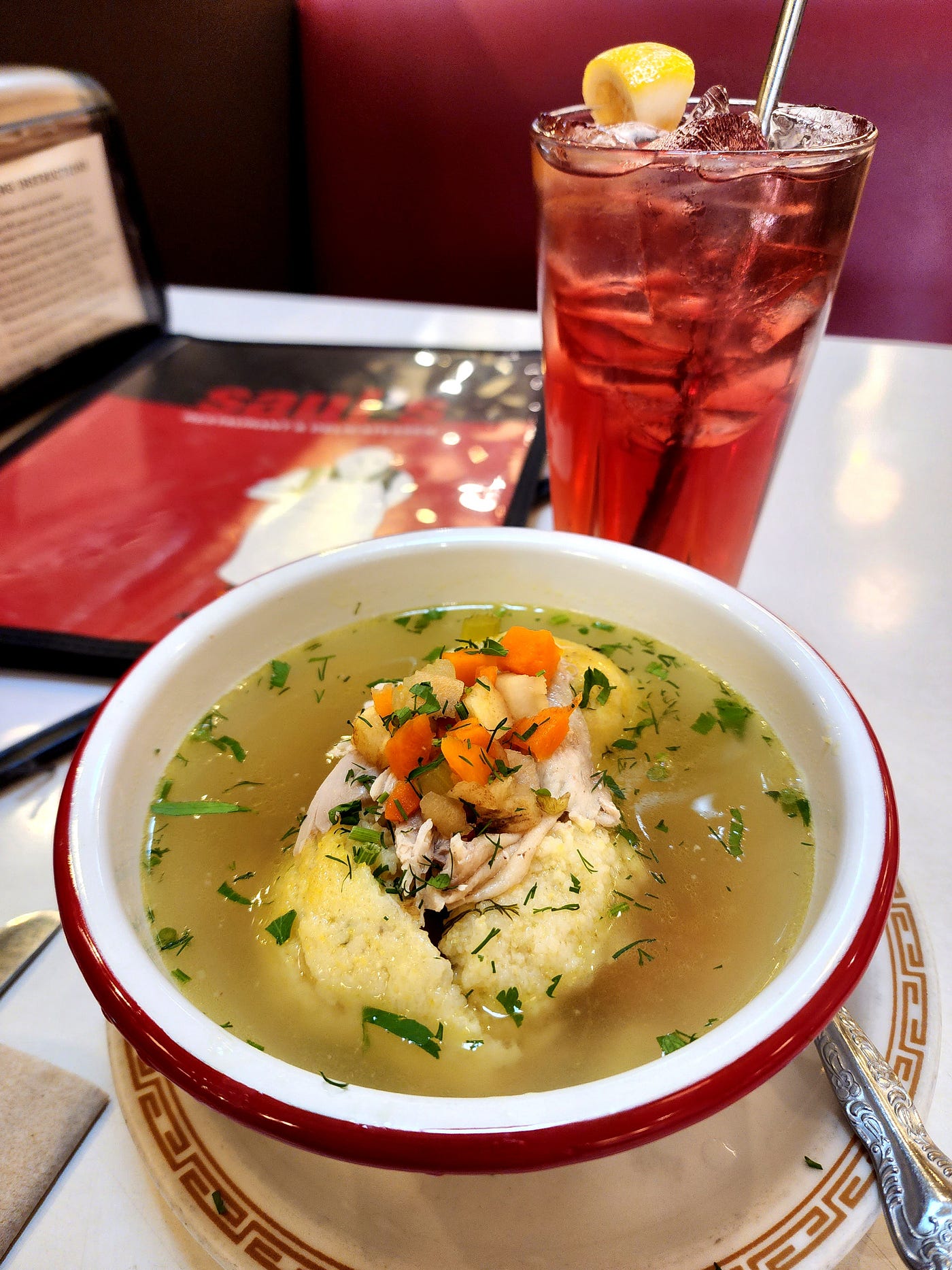 On a rainy day not long ago at Saul’s, I found a respectable corned beef sandwich, lox bagel and matzo ball soup, along with an amazing grape soda. “Respectable” for me resembles American Ashkenazi fare found in the Midwest (Corky & Lenny’s in Cleveland) and East Coast (Carnegie Deli, naturally).