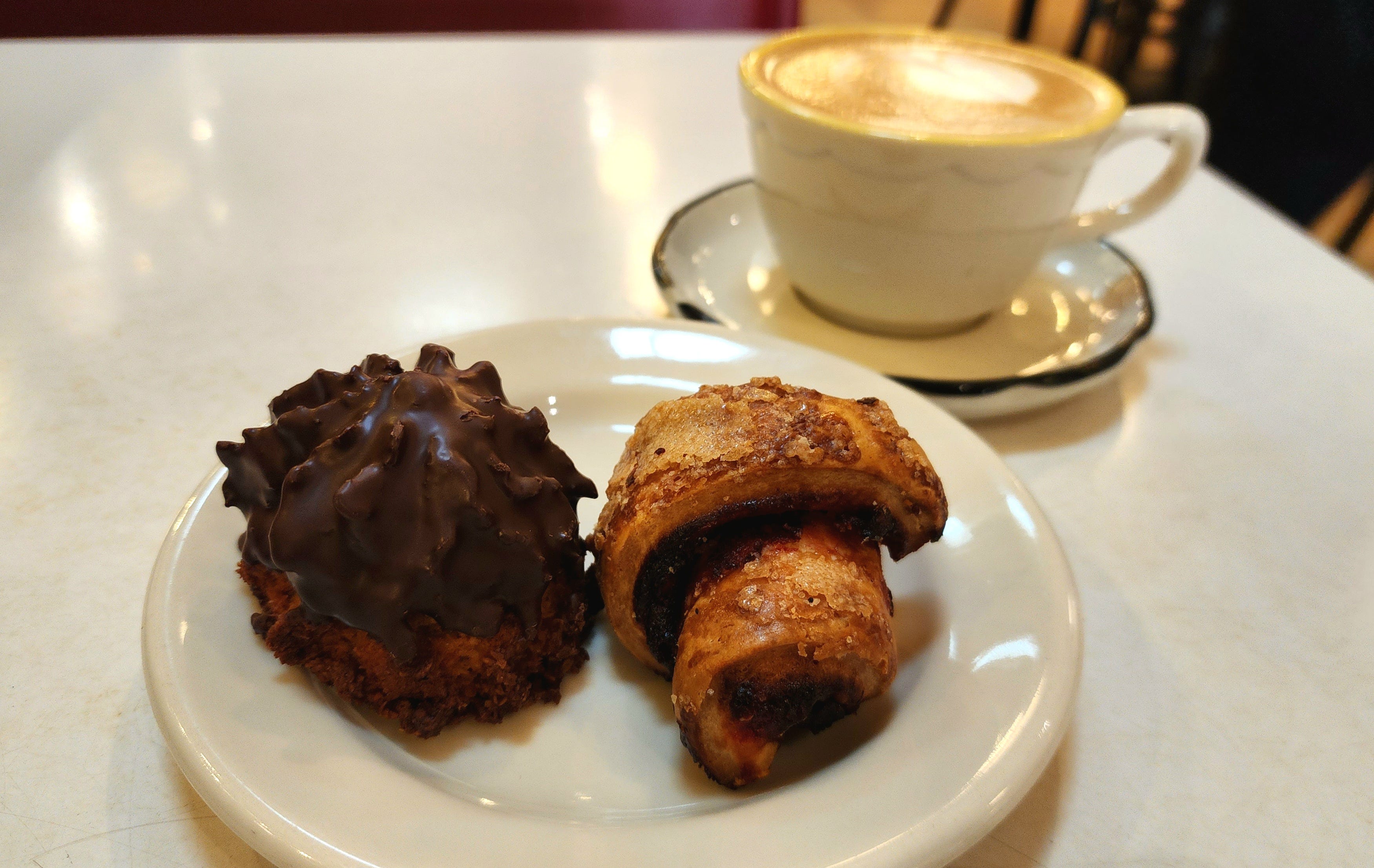 Nothing at Saul’s was quite the right size — I’m looking for a heart attack on a plate — but it all tasted great. I’ve never had toasted bread on my corned beef sandwich, and I felt robbed that it didn’t come with pickles. (Apparently you can order them individually for $1.50.) Other notable orders included a latke with applesauce and sour cream, a chocolate macaroon, and rugelach: