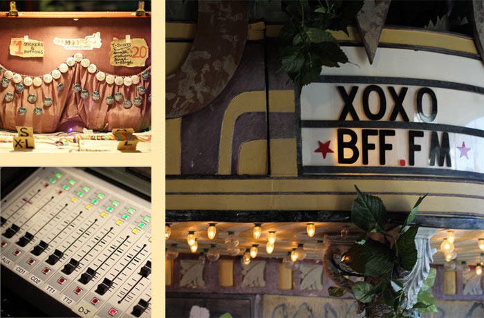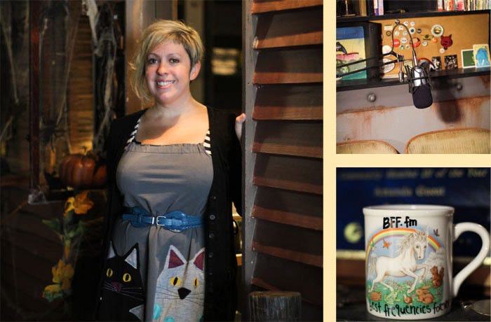 The Bold Italic hired Cosmic Amanda to DJ at a boat party we hosted during the Treasure Island Music Festival. The week before, Amanda showed me around BFF.fm’s headquarters within Secret Alley, where we bonded over the fact that she’s using a giant Oh Sees patch as decoration (they’re one of my all-time favorites as well). She explains that the tagline for her station is “the 24–7 mix tape you send to a friend,” and BFF.fm’s mix includes specialty shows in UK alt-rock, experimental electronic, and garage rock. Basically, BFF.fm is run by volunteers who, like Amanda, are “zeitgeist chasers” in whatever genres they geek out about. You can tune in to the station 24 hours a day, seven days a week, although the live programming runs only between 4 p.m. and midnight most evenings.