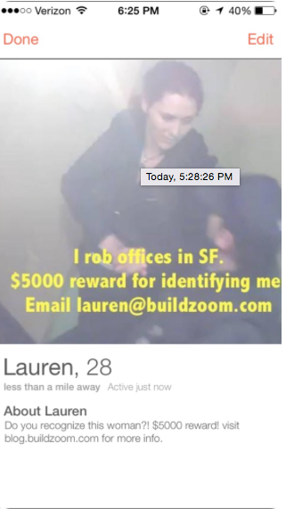 The last thing I expected to see Tinder used for was a 21st century version of a wanted poster. But that’s exactly what a startup has coopted the dating service for: to catch a hoodlum who’s been robbing BuildZoom’s SOMA headquarters.