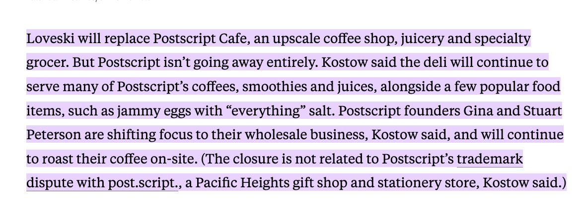 Perhaps the most surprising part of the exit? It wasn't the legal heat. For over a year, the café was locked in a trademark battle with post.script., a small stationery shop in Lower Pacific Heights. While that "David vs. Goliath" drama—filled with confused delivery drivers and overlapping lifestyle branding—made plenty of headlines, the Petersons maintain the closure was strictly a business pivot.