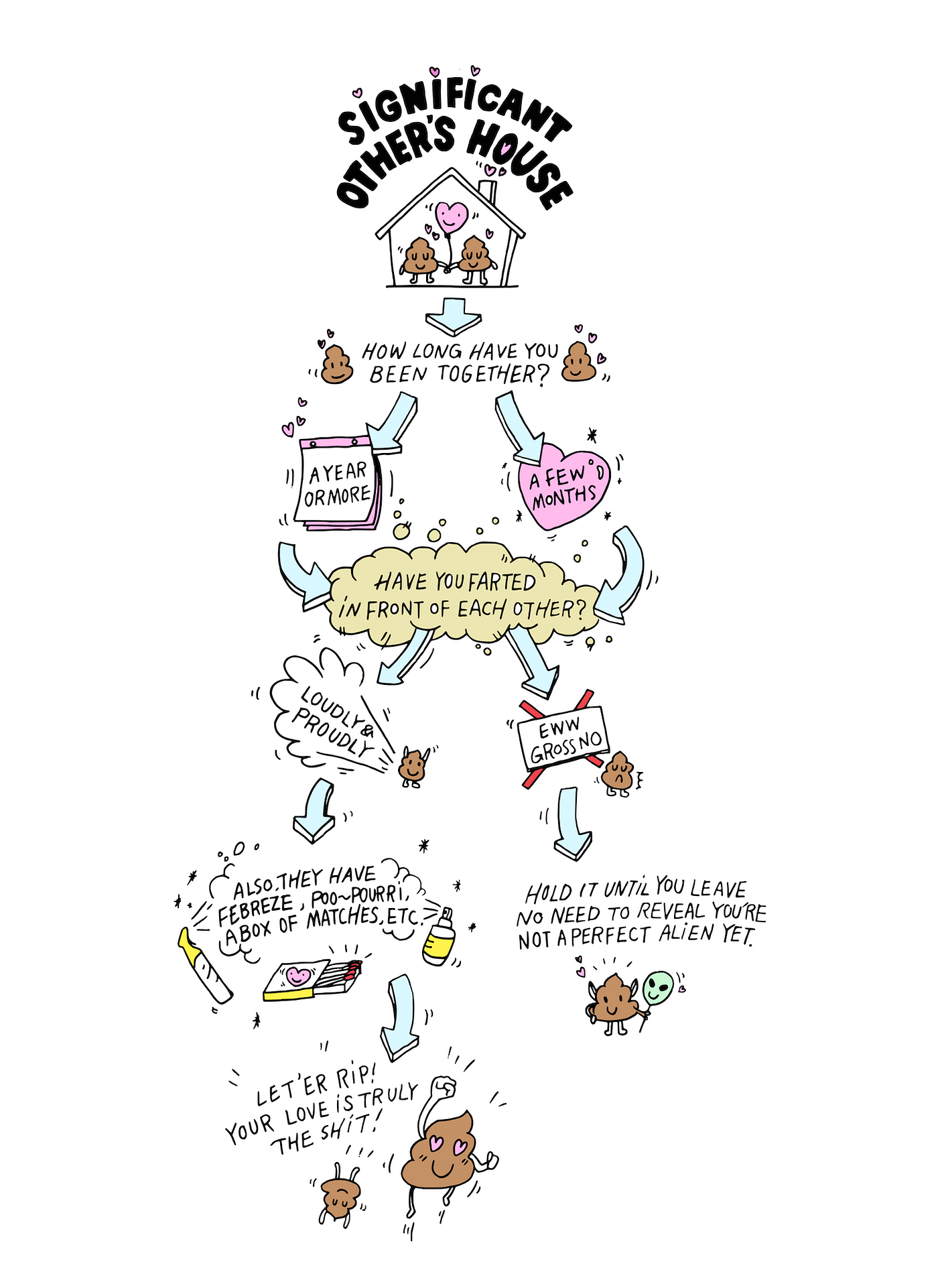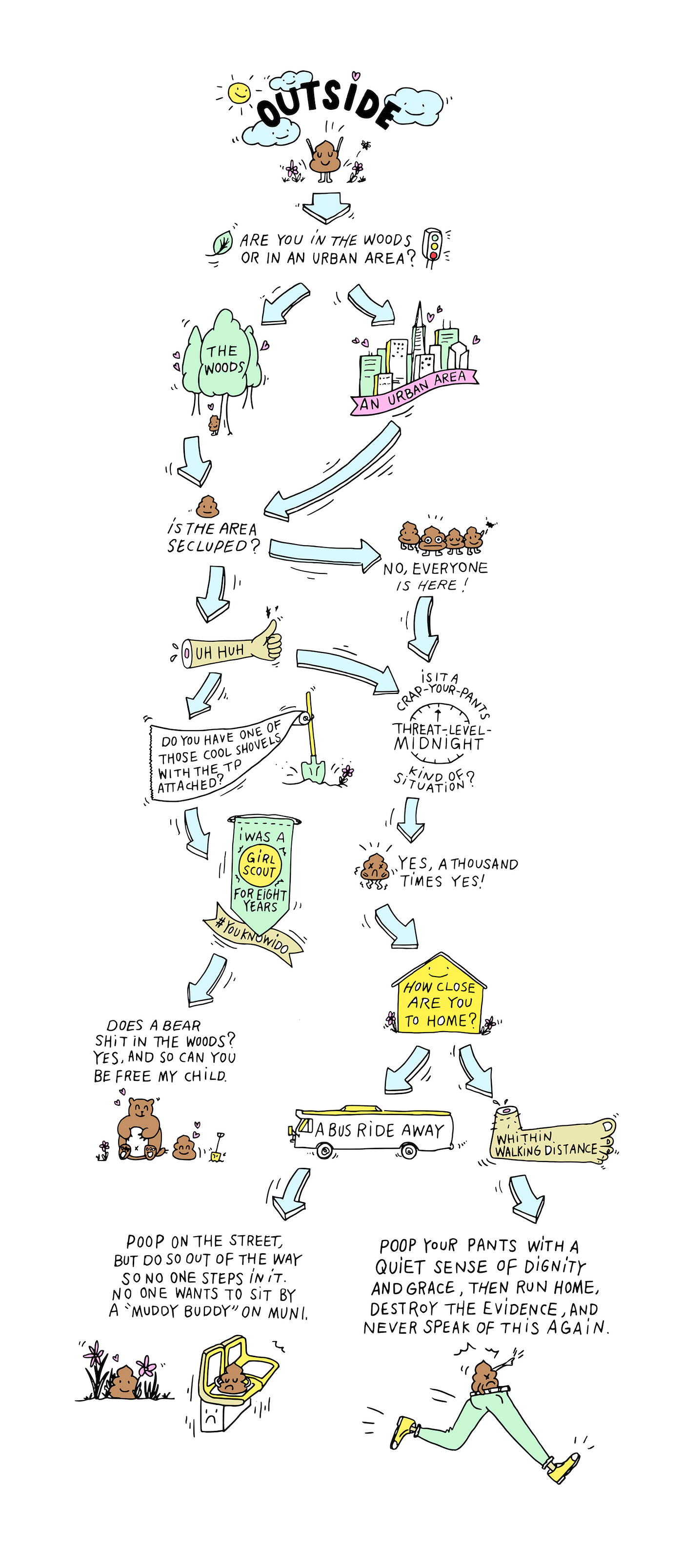In life we are faced with many questions. Where should I work? Who should I love? Why the heck are we even here at all? But really there is one question that demands to be answered on a (hopefully) daily basis: where can I poop? Now for most of our lives we feel confident answering “the bathroom, of course,” but occasionally we face drastic times that call for drastic measures. This chart will help you navigate your way through such fecal confusion.