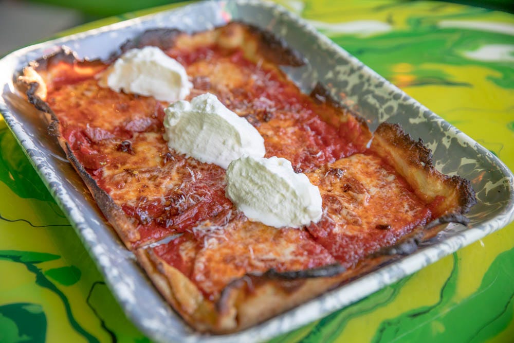 The menu is centered around Shuggie’s pies. Abe and Murphy debated ubiquitous styles of pizza like Neapolitan, but wisely went with a unique pizza format in a city that already excels at Neapolitan and many other pizza styles besides. They’ve crafted a crave-worthy, uber-thin version of rectangular grandma pizza, with its roots in Long Island, it’s a slimmer version of Sicilian pizza. But this isn’t so much traditional NY grandma pizza as it is their inspired take with crispy edges that crust up and around the pie.