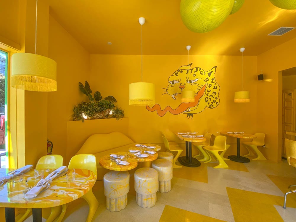 As of April 19, 2022, the space is (dramatically) reborn as Shuggie’s Trash Pie & Natural Wine, no longer dim and dusty but colorful, loud and playful in bold yellow and green. Given the deteriorating nature of the front room, it had to be gutted and rebuilt, now all yellow and white, lined with yellow disco balls, lip-shaped sofa and cheetah mural, centered around an open kitchen with bar seats over a glittery gold countertop.