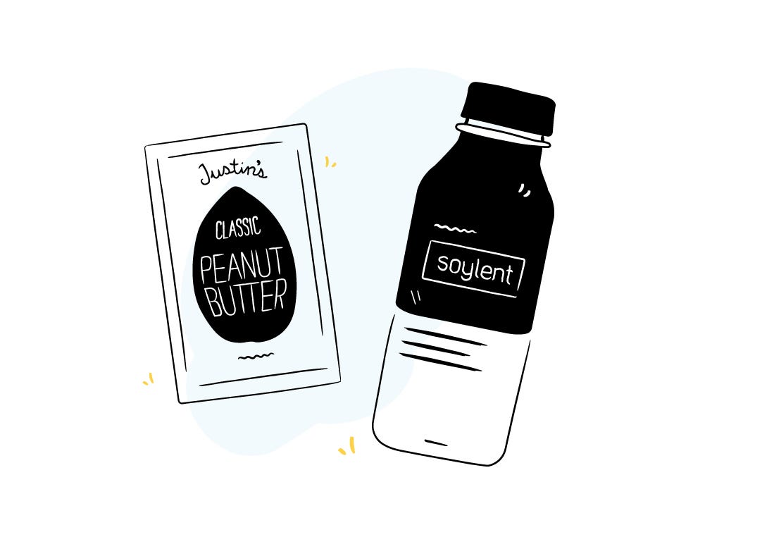 - 1 bottle Soylent (recommended: Original, Cacao, Cafe Vanilla)