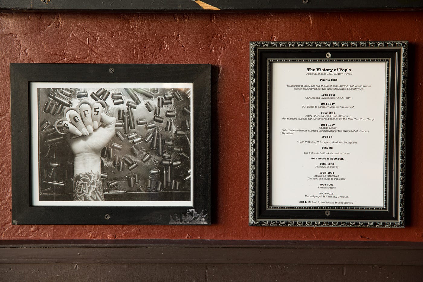 Pop’s Bar has been a fixture of the Mission for as long as it was legal to drink (and secretly since it wasn’t legal). Carl Joseph Saxsenmeier, who everyone called “Pops,” was a bootlegger and ran a “clubhouse” during Prohibition. When Prohibition ended in the early ’30s he opened Pop’s Bar. It has changed ownership virtually every decade since Saxsenmeier opened the bar on 24th Street, but it remained in continuous operation for 80 years, until it was sold in 2013 to Michael Krouse and Tom Tierney, and closed for remodel.