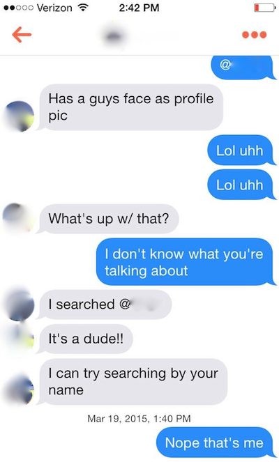 One man sought to hack the system, literally. The Verge reported today that a California man (real name unknown) recently hacked Tinder’s API so that dudes who thought they were chatting with women were actually talking to other dudes.