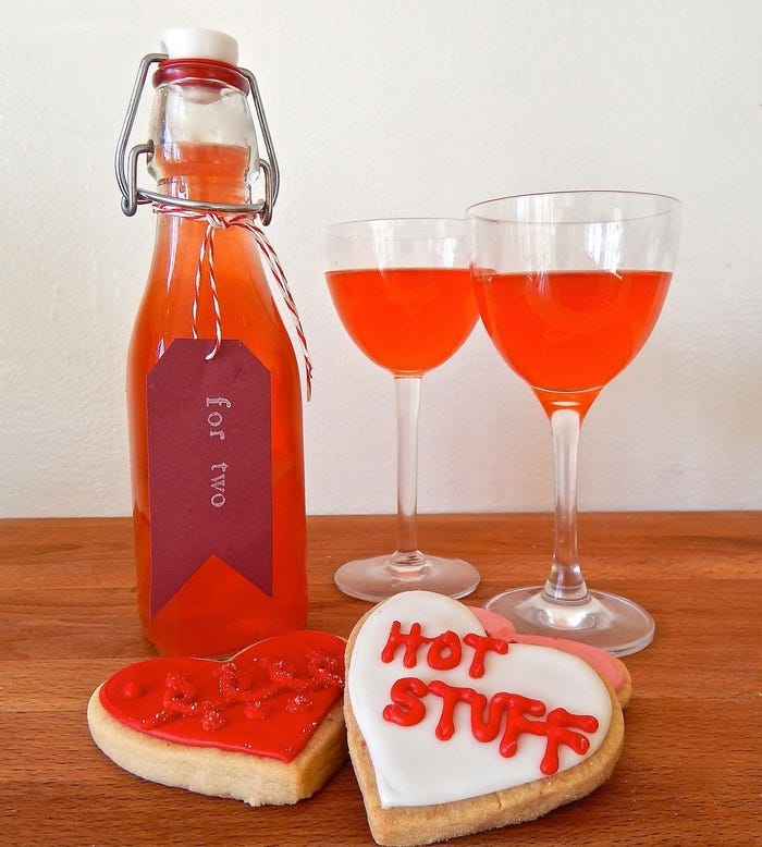 Serve cold in two chilled cordial glasses. Goes well with cookies, like these heart-shaped ones from Batter Bakery.