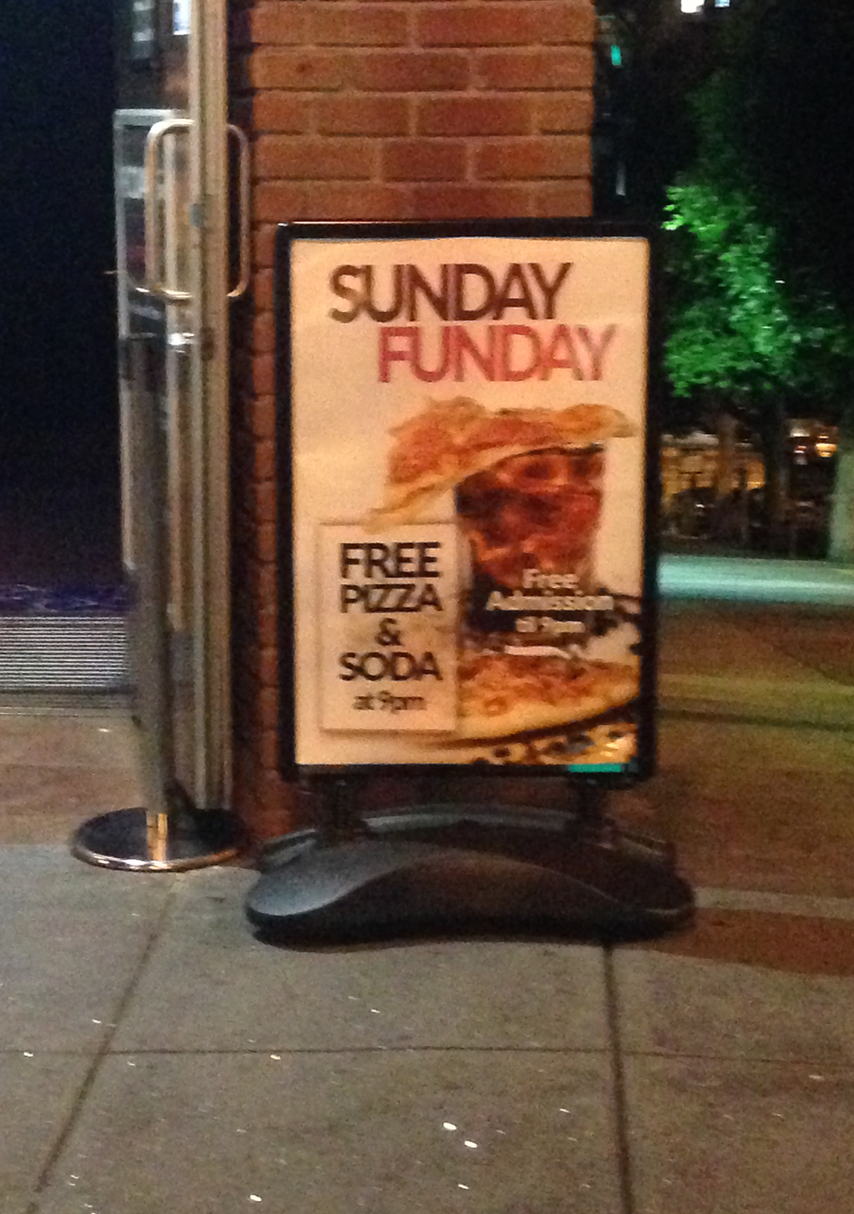 “Free” is a magical word — magical enough to get me to Centerfolds at 9:00 p.m. on a Sunday. Each “Sunday Funday,” Centerfolds offers free pizza and soda. (Fully nude strip clubs like Centerfolds cannot serve booze in California.) My friend Jordan was intrigued by the free dinner and, presumably, also by the women, so he came along for the ride.