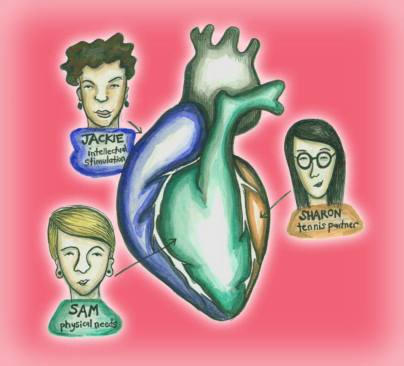 One of the most relatable descriptions I got was from Jade, who is new to polyamory. She told me that just as her different friendships fulfill different needs, she can’t expect to get everything she needs from one person. Jade explained that her best friend Jessica is great for helping her calm down after rants and talking through things. Jessica is her primary best friend (related to the idea of having a primary partner in a poly relationship). Meanwhile, Jade’s other best friend, Renee, is fun to do girly things with, but not good for emotional support. Renee is there for Jade in different ways than Jessica is, but she loves them both equally and can’t imagine her life without either of them.
