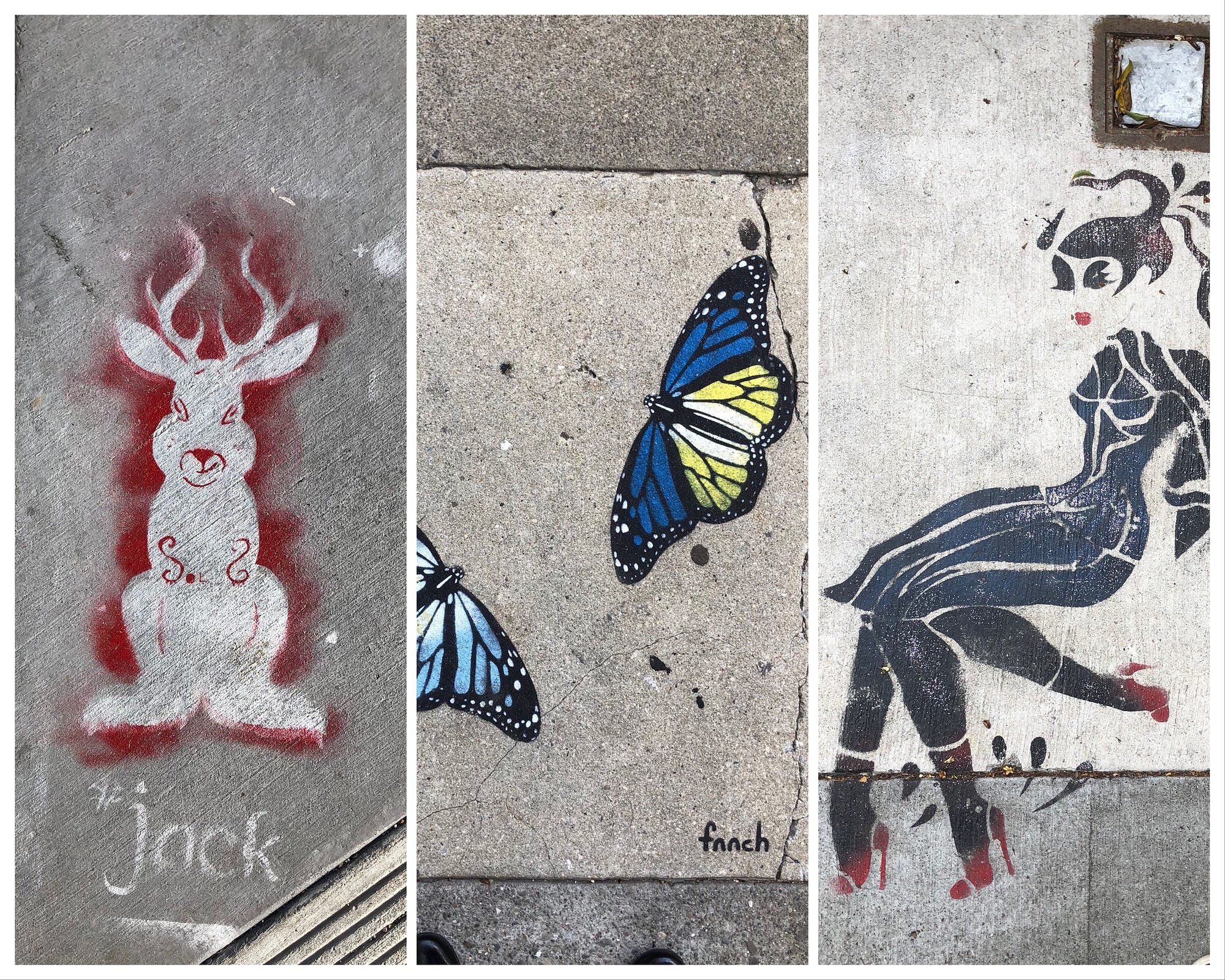 Shortly after, I discovered that local artist fnnch had stenciled these, along with two brilliant blue butterflies on the sidewalk in my neighborhood. I took a photo of those too—they were the seeds that launched an Instagram account I’ve been running ever since—@sfsidewalks. I scan for not just what to avoid but also what to admire. And in doing so, I’ve come across a handful of street artists whose stencils adorn the concrete across these 49 square miles.