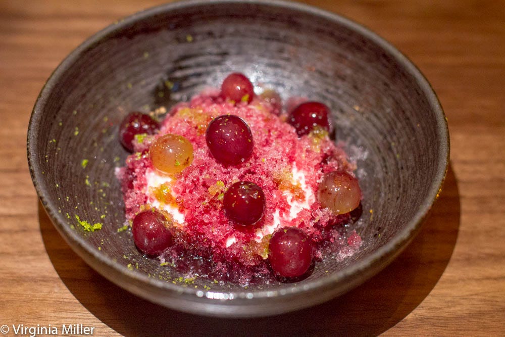 Not forgetting chef Hou’s pastry chef history in three Michelin echelons, dessert was a must despite being stuffed. I’m immediately drawn to chocolate peanut butter mousse, as a top childhood flavor, especially with coffee kombucha foam, cocoa nib granita and salted caramel ice cream. But my favorite was nutty, gently sour (exuding yogurt vibes) almond ice cream and hibiscus granita dotted with effervescent, carbonated grapes (you heard right) and an herbaceous touch of lovage oil. A light, bright beauty.