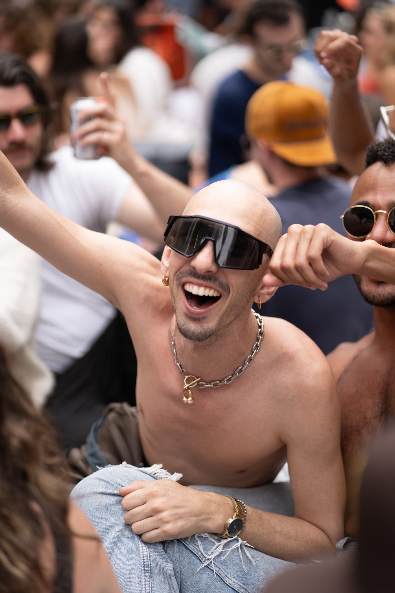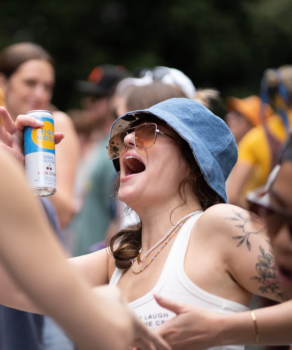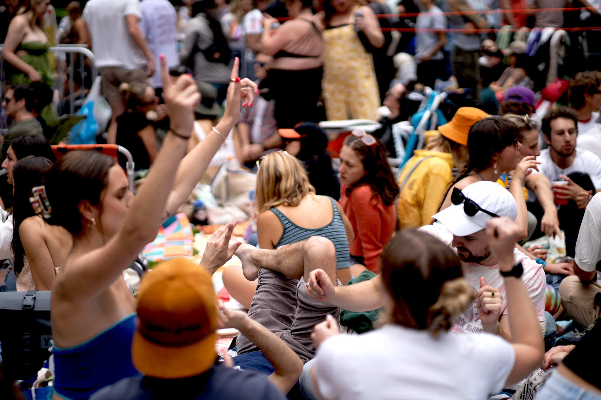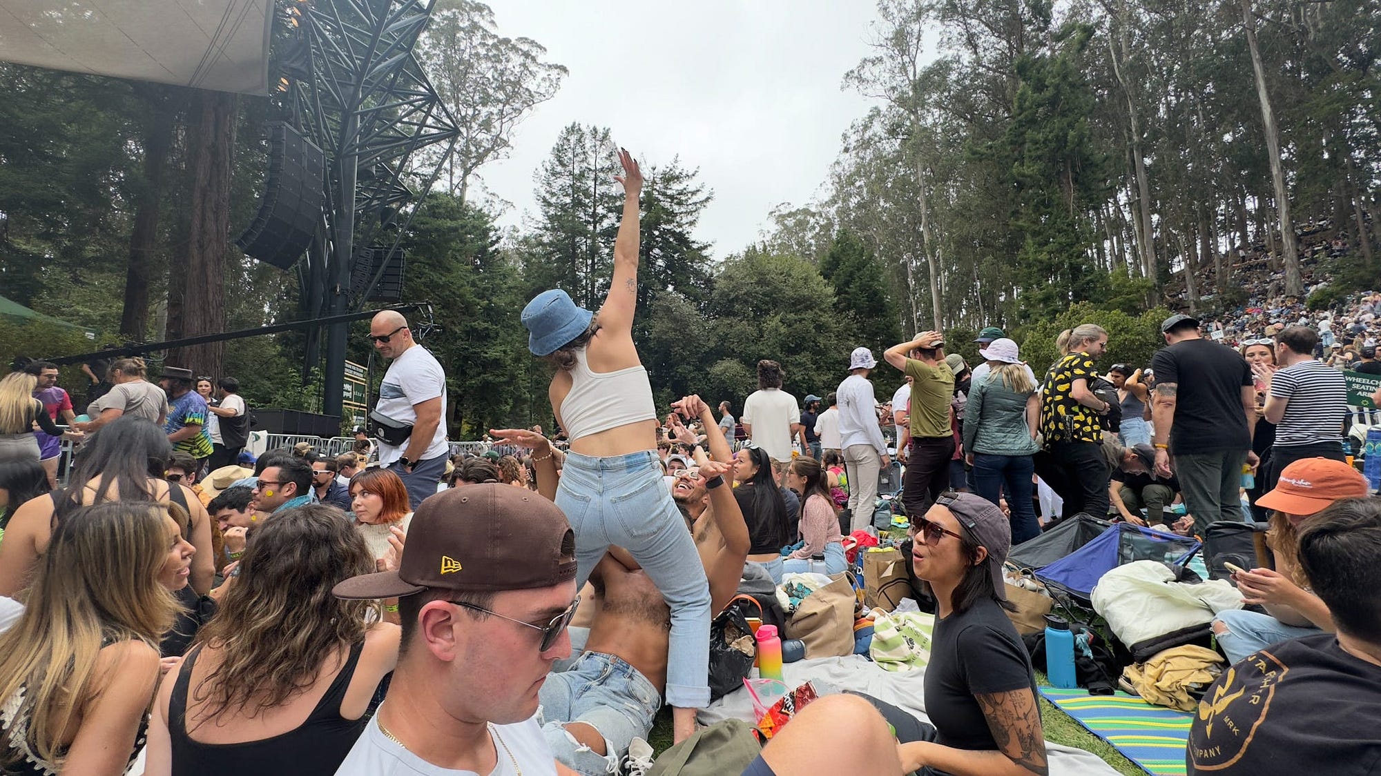 This concert was much more crowded than the Franc Moody one that I went to a few weeks back. Even at 1:00 there was no space on the flat part in front of the stage so we had to do a little hiking, which really was not what I wanted to be doing at this point in the trip. We found the flatest part that we could — only about a 60-degree angle. We posted up leaning on each other to minimize the sliding of our butts. I didn’t love this seating situation and I also decided there was no way for me to get to the bathroom under these conditions if I needed it. I wasn’t stable enough at this point to do that climb again.