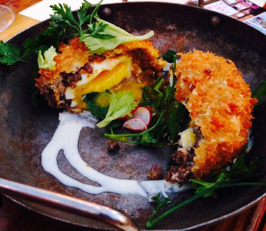 Start with the Scotch Eggs at Tart’s in The Farmer’s Daughter Hotel near The Grove which is available during brunch on the retro-cool patio. The exterior texture is fried and crunchy with a soft melting center, just the way it should be. Other popular cure-all options include the fried chicken and waffle with tabasco-maple butter; the breakfast burrito stuffed with scrambled eggs, chorizo, white cheddar, potato, salsa verde, and lime cream in a flour tortilla; and lastly, the Hanger steak with two sunny side up eggs and French fries. All dishes pair well with a hair-of-the-dog punch bowl from tea punch with vodka (the caffeine will help); the “Blackballing Punch” with homemade blackberry vodka, Orange, Cranberry (you need your vitamin C now), or the “Whole Family Punch” with peach vodka and Champagne since bubbles and carbonation are also your friend right now.