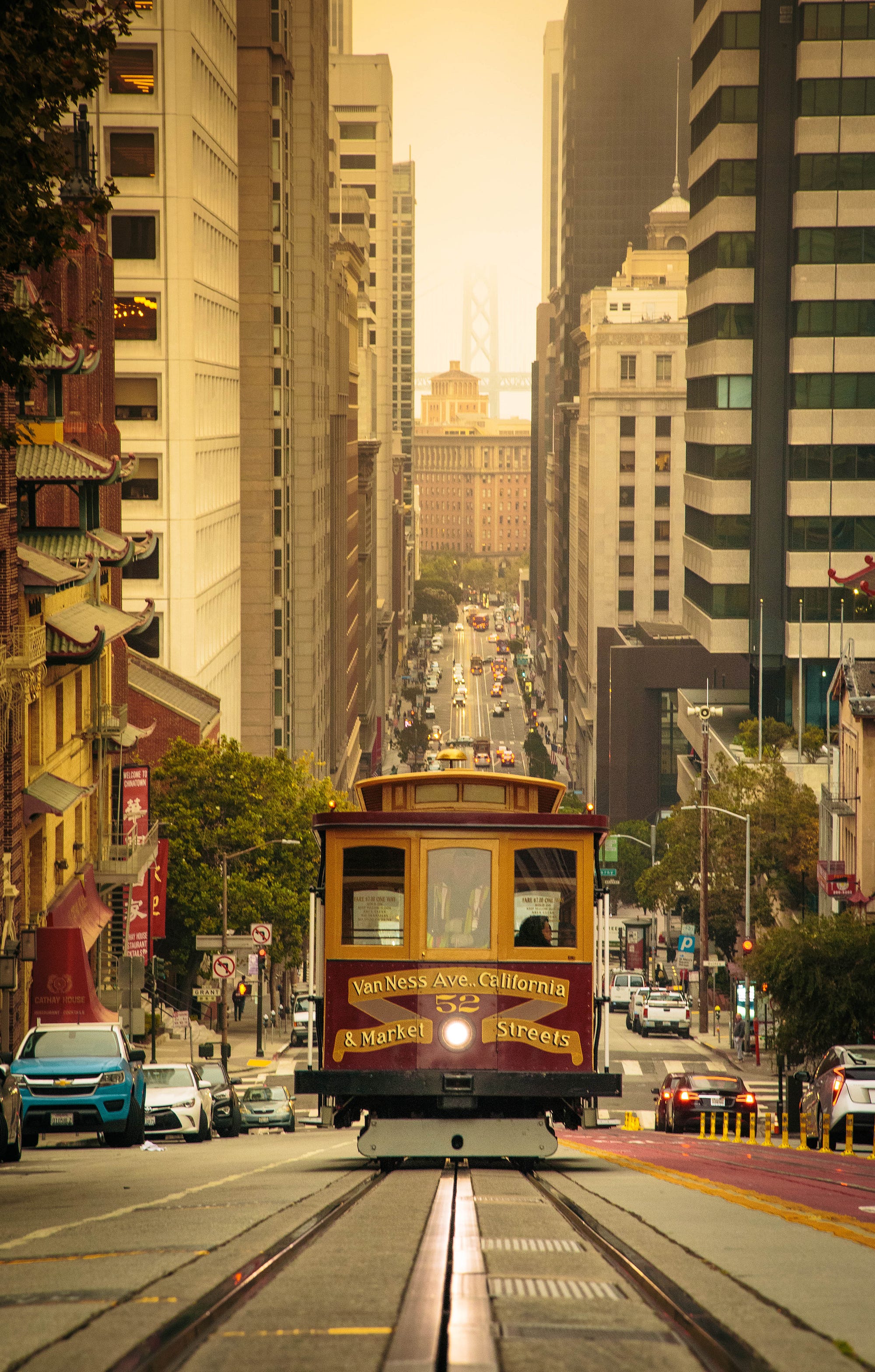 I used to work in the FiDi and would always see the cable cars rolling down California Street, so one morning I decided to wake up early and try to catch the first cable car up the hill. This was the view I found—downtown, the Bay Bridge and many other buildings being bathed in morning light.